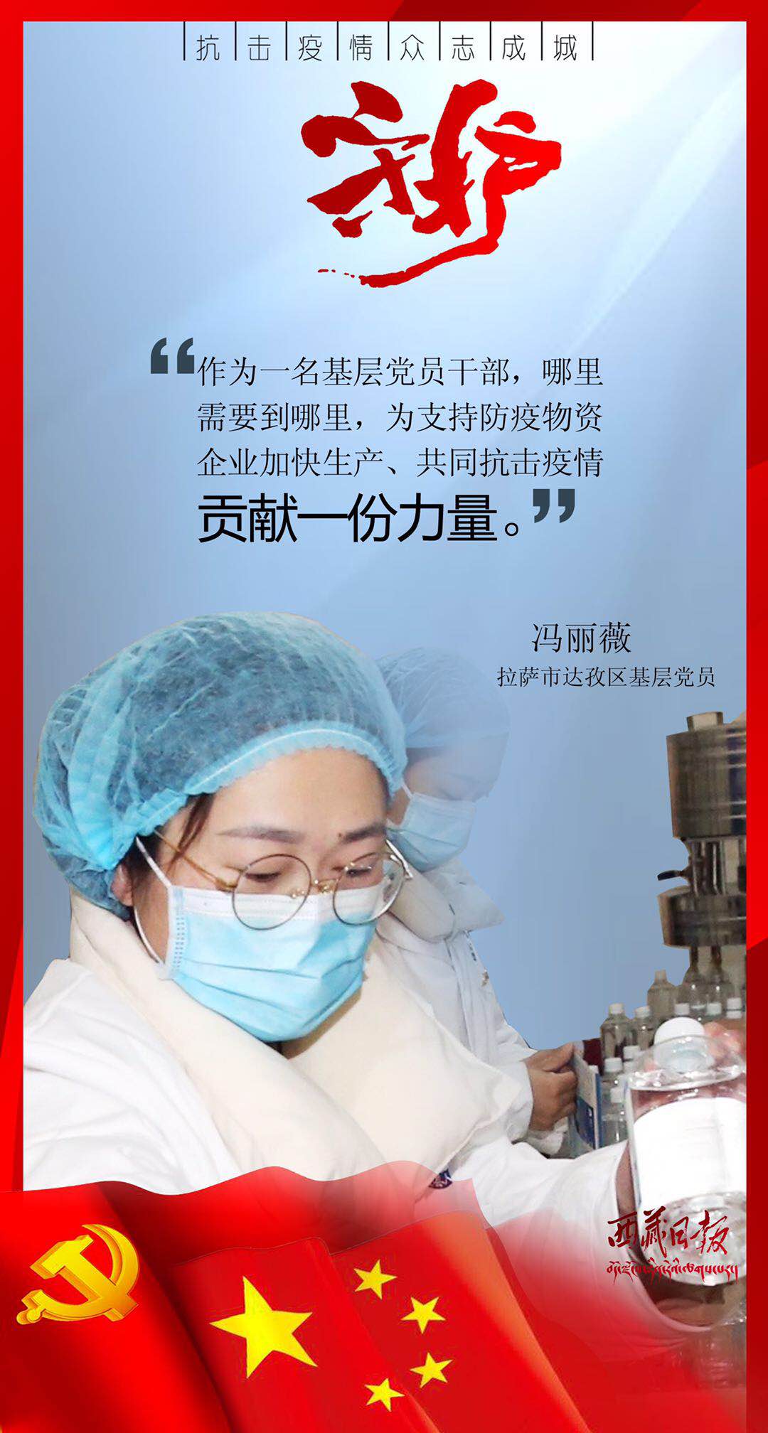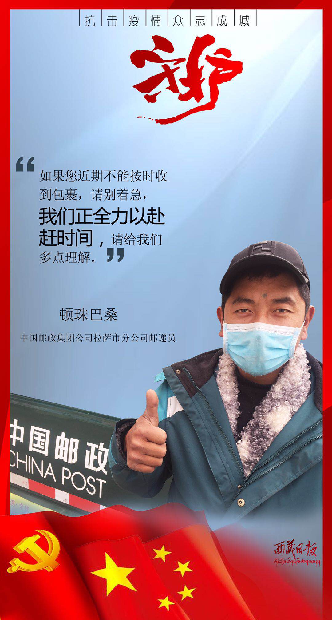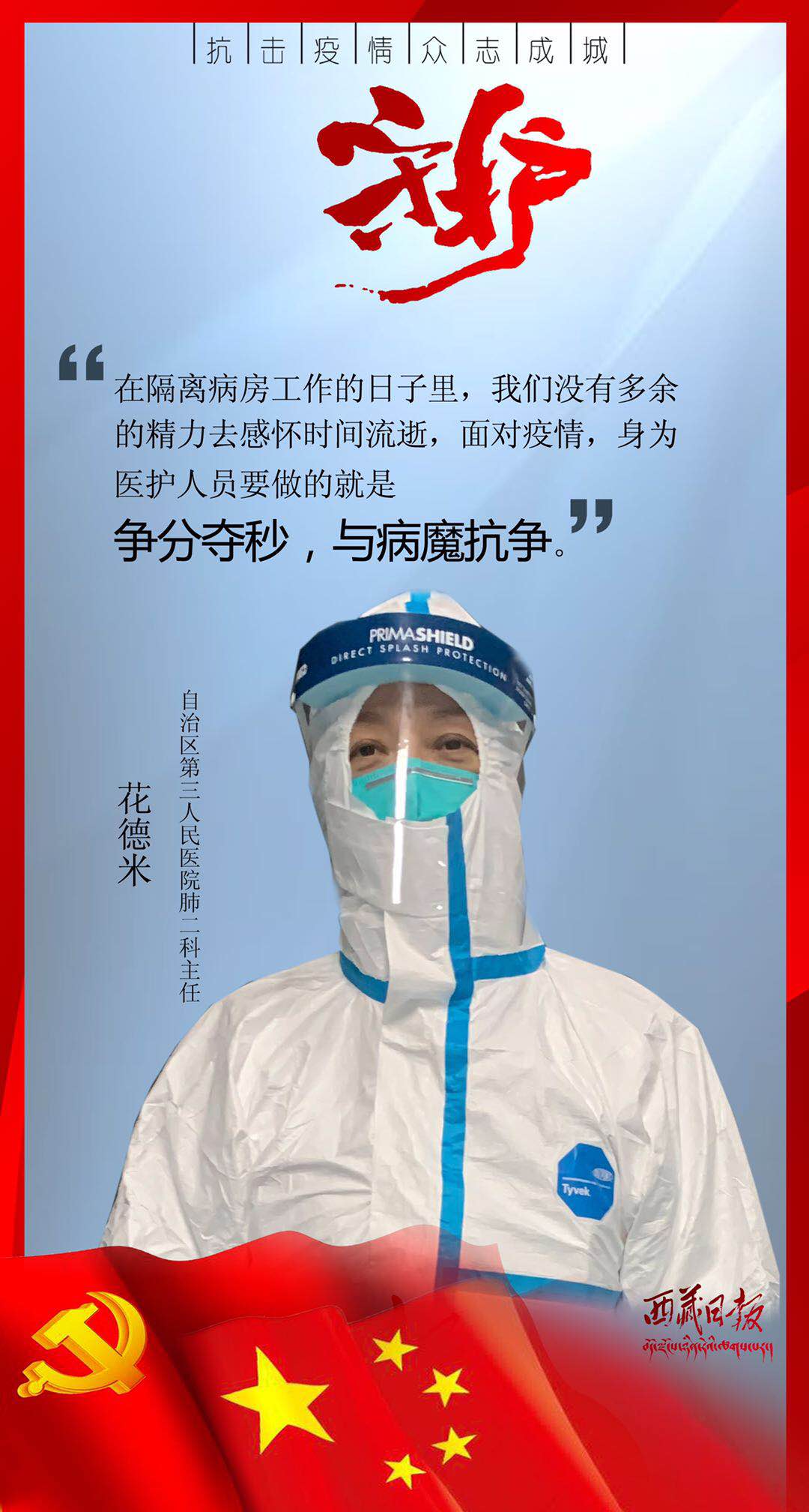 疫情来袭,有这么一群人,或临危受命,或主动请缨,用贴心呵护生命,用爱心守护平安,筑起了雪域高原抗击疫情的最强防线。在医疗救治一线,他们舍身忘我、无私无畏,与病毒进行生与死的对抗;在交通管控一线,他们顶风冒雨、日夜坚守,守护疫情防控第一道关口;在农村社区一线,他们马不停蹄、走村入户,严而有情为隔离人员嘘寒问暖;在生产保供一线,他们坚守岗位、加班加点,为满足疫情防控和群众生产生活必需物资而全力以赴……丹心照雪域,正气满乾坤。是他们用有力行动顶住了疫情冲击、用无私奉献守护了人民安康、用暖暖真情传递了人间大爱。他们是疫情防控最有担当的勇士,是城市守护最有魅力的使者,是新时代最可爱的人。