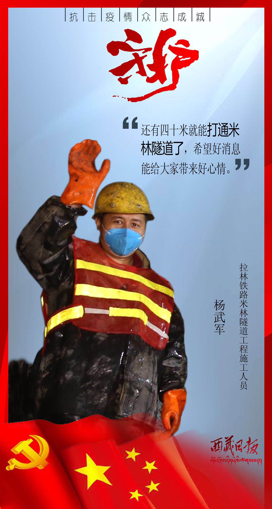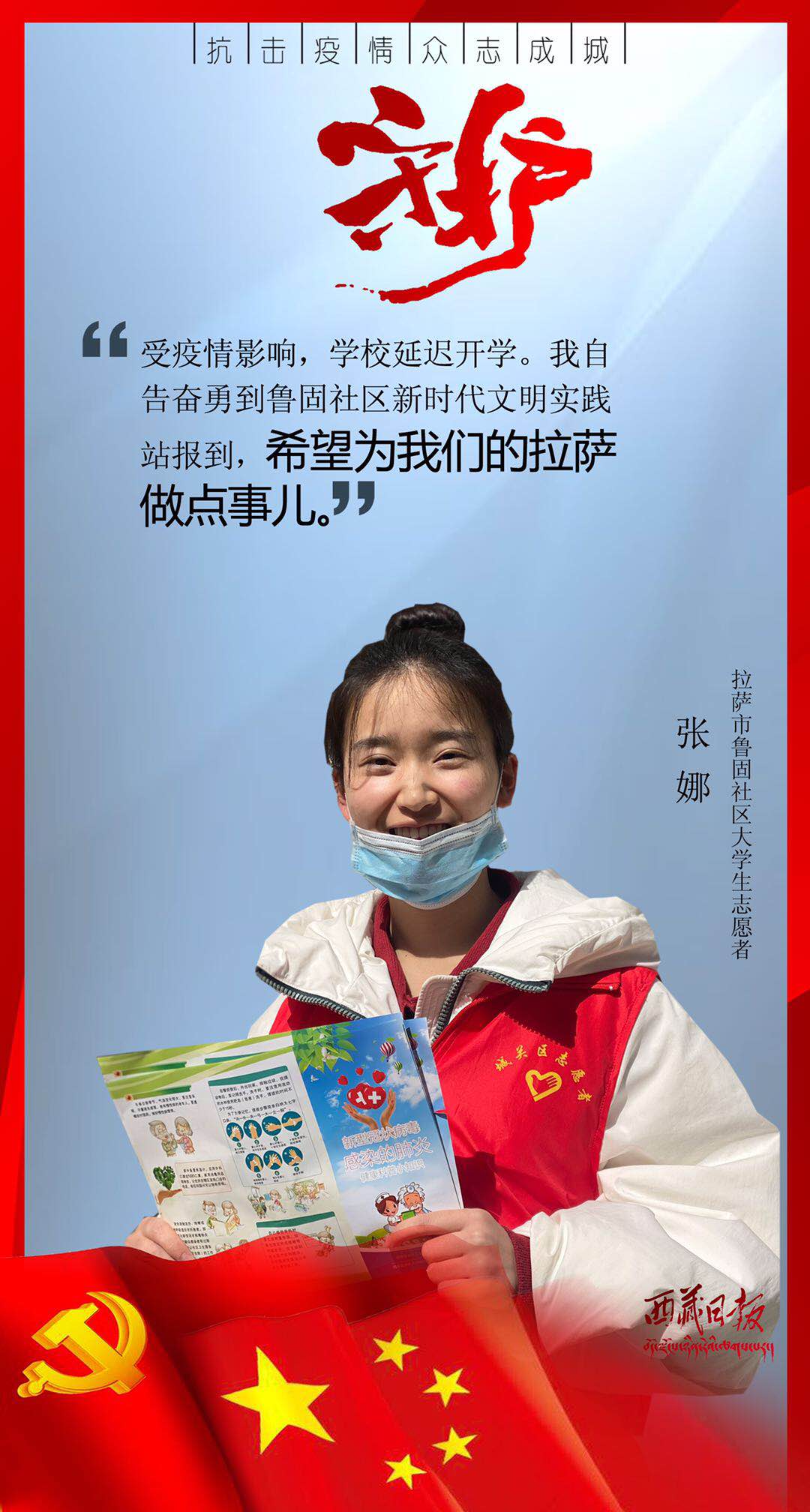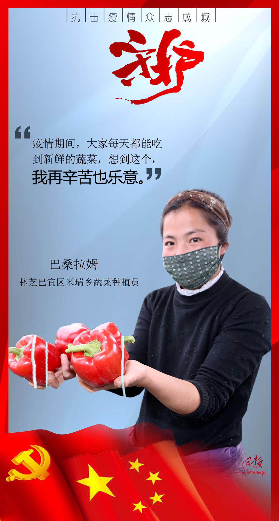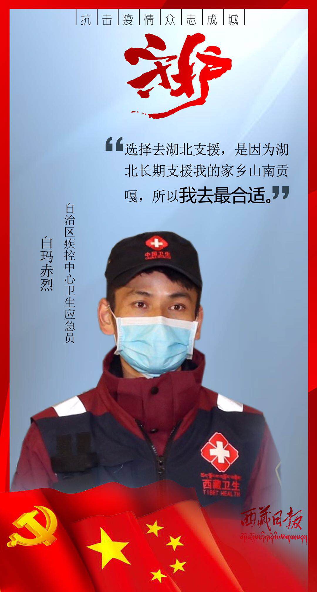 疫情来袭,有这么一群人,或临危受命,或主动请缨,用贴心呵护生命,用爱心守护平安,筑起了雪域高原抗击疫情的最强防线。在医疗救治一线,他们舍身忘我、无私无畏,与病毒进行生与死的对抗;在交通管控一线,他们顶风冒雨、日夜坚守,守护疫情防控第一道关口;在农村社区一线,他们马不停蹄、走村入户,严而有情为隔离人员嘘寒问暖;在生产保供一线,他们坚守岗位、加班加点,为满足疫情防控和群众生产生活必需物资而全力以赴……丹心照雪域,正气满乾坤。是他们用有力行动顶住了疫情冲击、用无私奉献守护了人民安康、用暖暖真情传递了人间大爱。他们是疫情防控最有担当的勇士,是城市守护最有魅力的使者,是新时代最可爱的人。