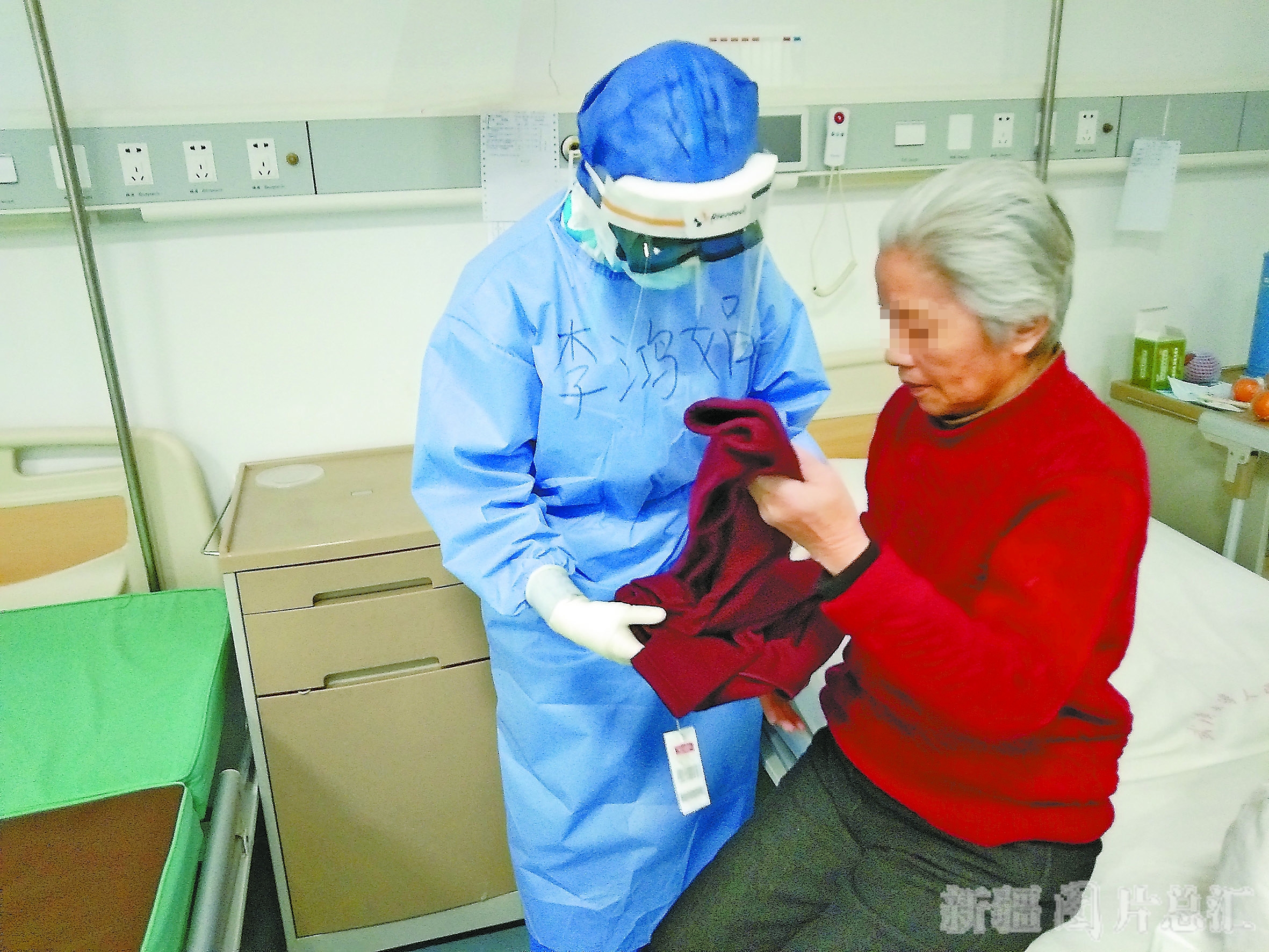 3月14日,李鸿娟给新冠肺炎患者李奶奶送保暖衣。 (图片由新疆第三批支援湖北医疗队提供)