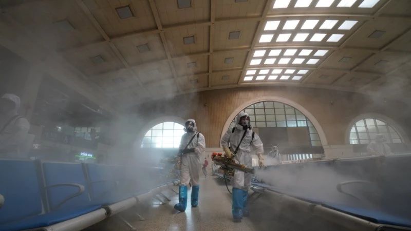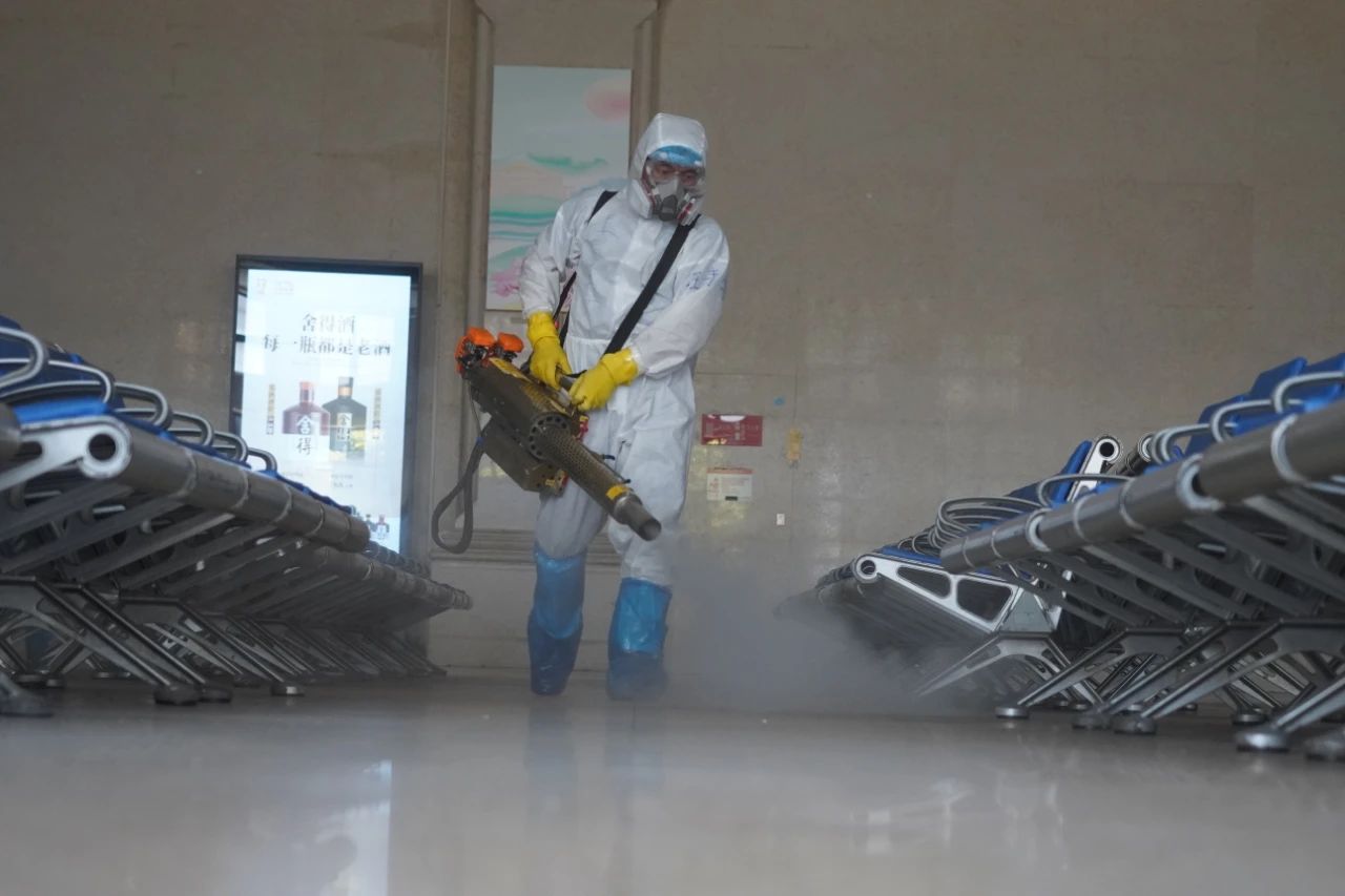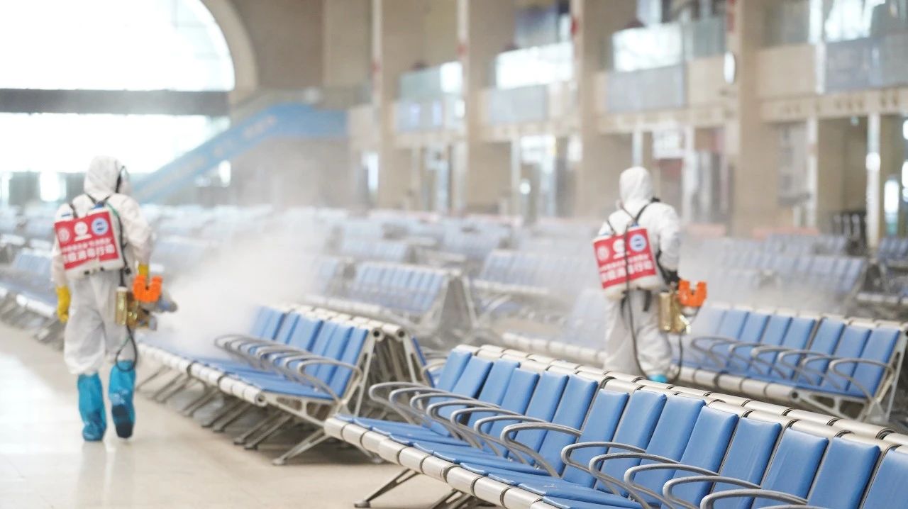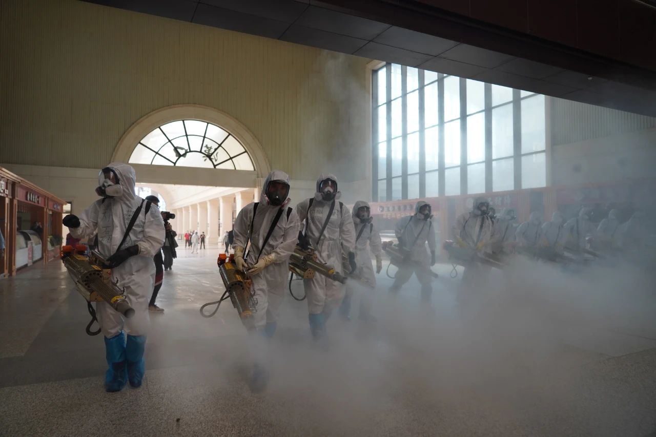 蓝天救援队队员,身背二氧化氯消毒液,手执双管脉冲弥雾机,对火车站内地面、电梯、座椅等,各种公共设施进行全面消杀。确保这座城市交通枢纽在疫情防控最终环节,不留死角、不留盲区。
