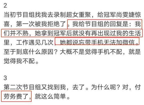 许飞继而又在5日发了长文斥责尚雯婕的虚伪,说她多次以没带手机为由拒绝加自己的微信,自己之所以会参加只是因为收了劳务费去唱歌的。