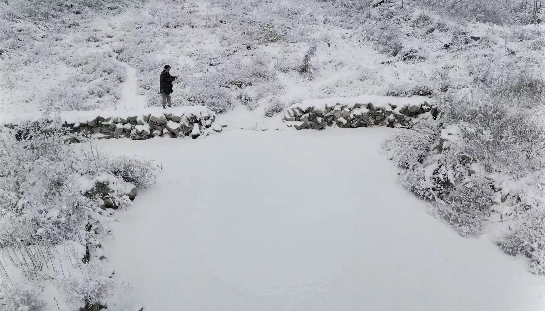 贾廷峰:冰面也是一个奇特的存在,它非常非常开阔,原先是一片湖,入冬后变成了白茫茫的冰面。我每天在那儿行走,突然想,如果遴选出一部分摄影作品放置在那儿,让无人机代替世人在空中鸟瞰它们,是不是一次非常有趣的对话?俗话说,滴水成冰,化冰为水,小溪欢畅存在的时候,涓涓流向了湖,如今“干涸”的小溪以图片方式躺于冰面怀抱,挺有意味。