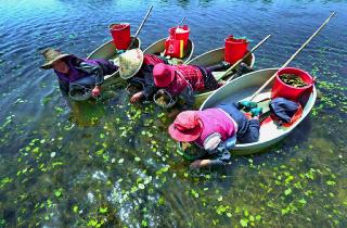 经过一个冬蛰,湖底的根茎抽出嫩梢。身披晨曦的采莼女,伏卧长脚盆,两眼扫视水下,双手灵巧地掐尖儿,一叶叶拖着黏液的莼叶被投入浮篮。