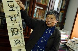 日前去看望简出的周慧珺,闲聊中,这位大书法家见示一对石鼓文联(大篆的一种)及一幅兰花,令我瞠愕:“周体”早已风行天下,不料其大篆也写得那么劲健断续,高古逸宕;再看几叶丹青兰英,枯涩兼采,真是出圣入神,探观止矣……! (文汇报记者谢震霖 摄影报道)