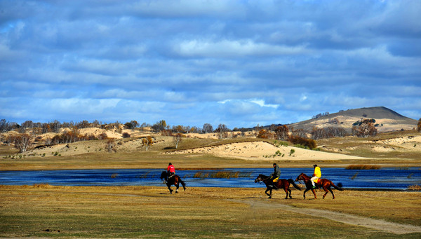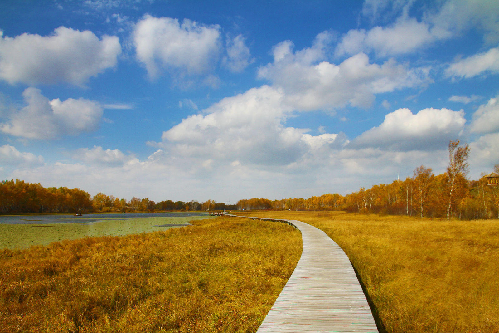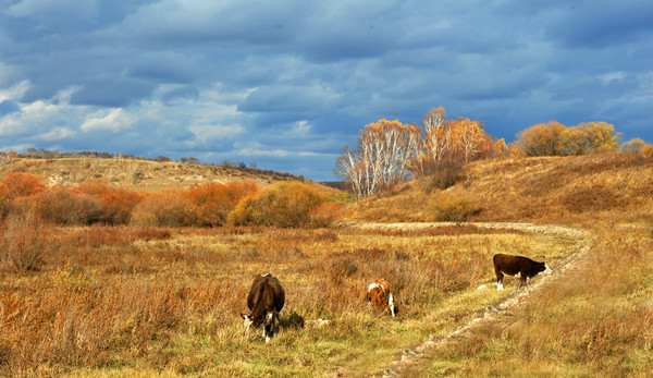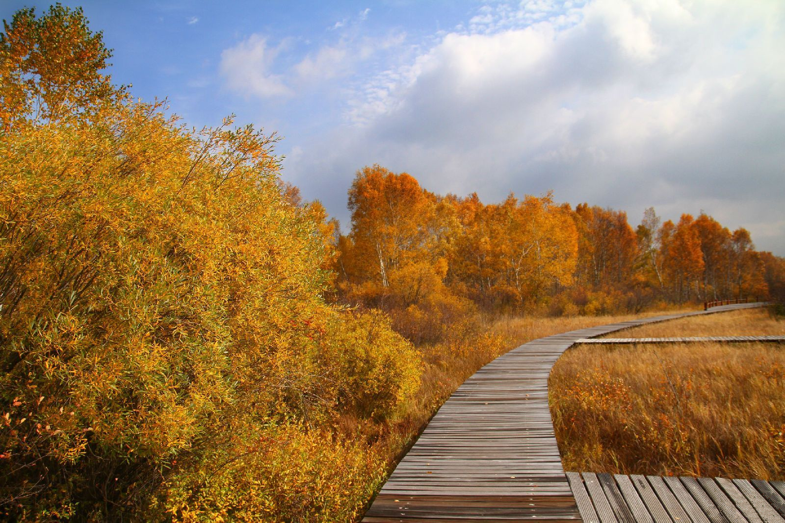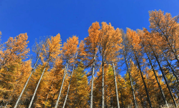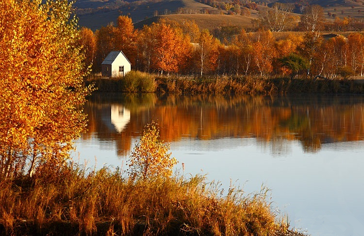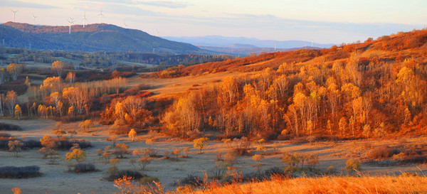 承德坝上地区的塞罕坝,曾是 "木兰围场"的一部分。七星湖,公主湖,太阳湖等湖泊星罗棋布在浩瀚的林海与广袤的草原中。蓝天白云时常引着秋山和树木的影子落到湖中,给塞罕坝的秋色平添了许多灵性。远处,稠密的白桦林、蒙古栎、山杨树犹如一团团五彩缤纷的锦绣……
