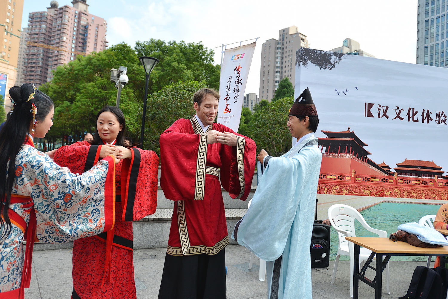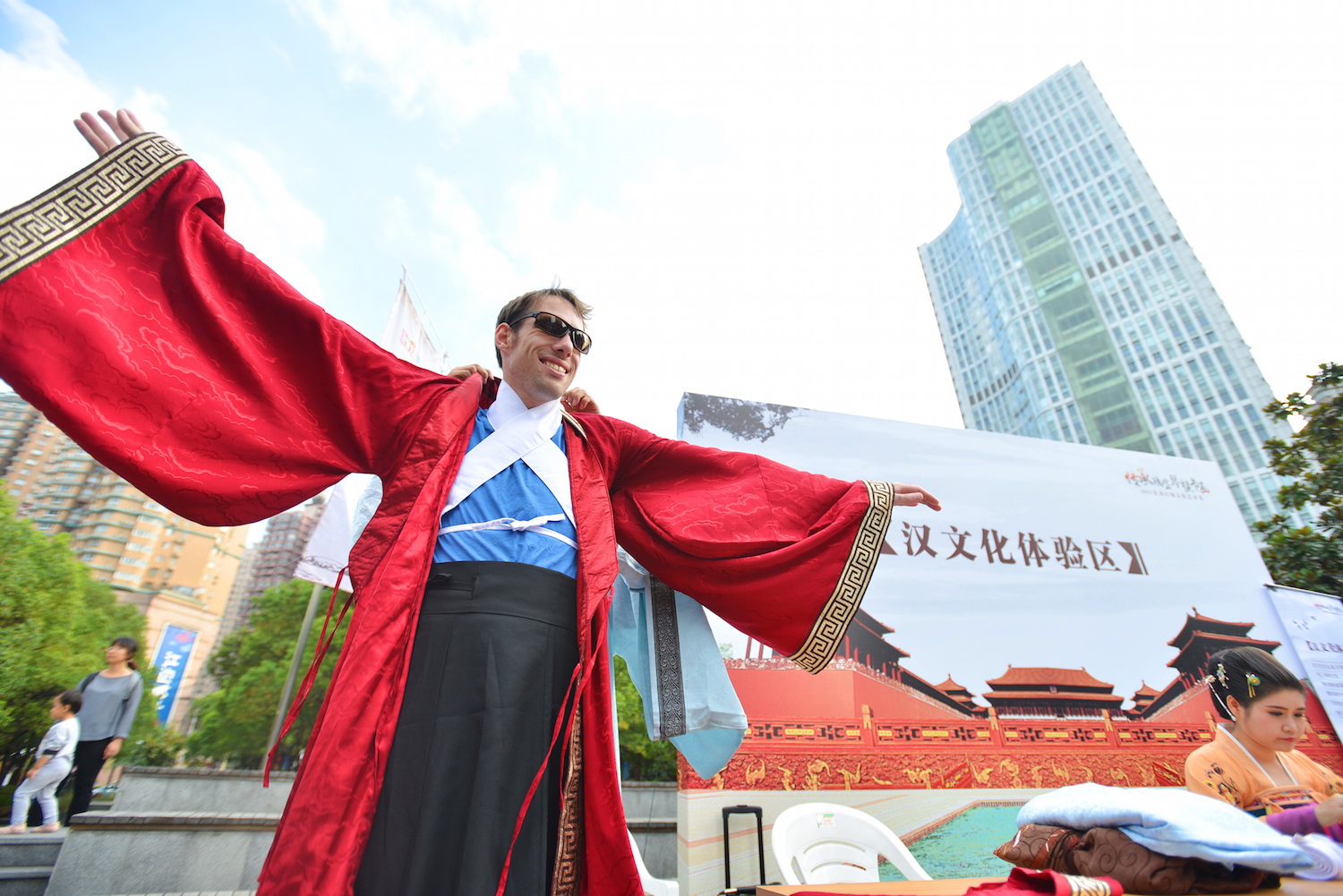 图为一位来自澳大利亚的游客正在体验试穿汉朝服饰。