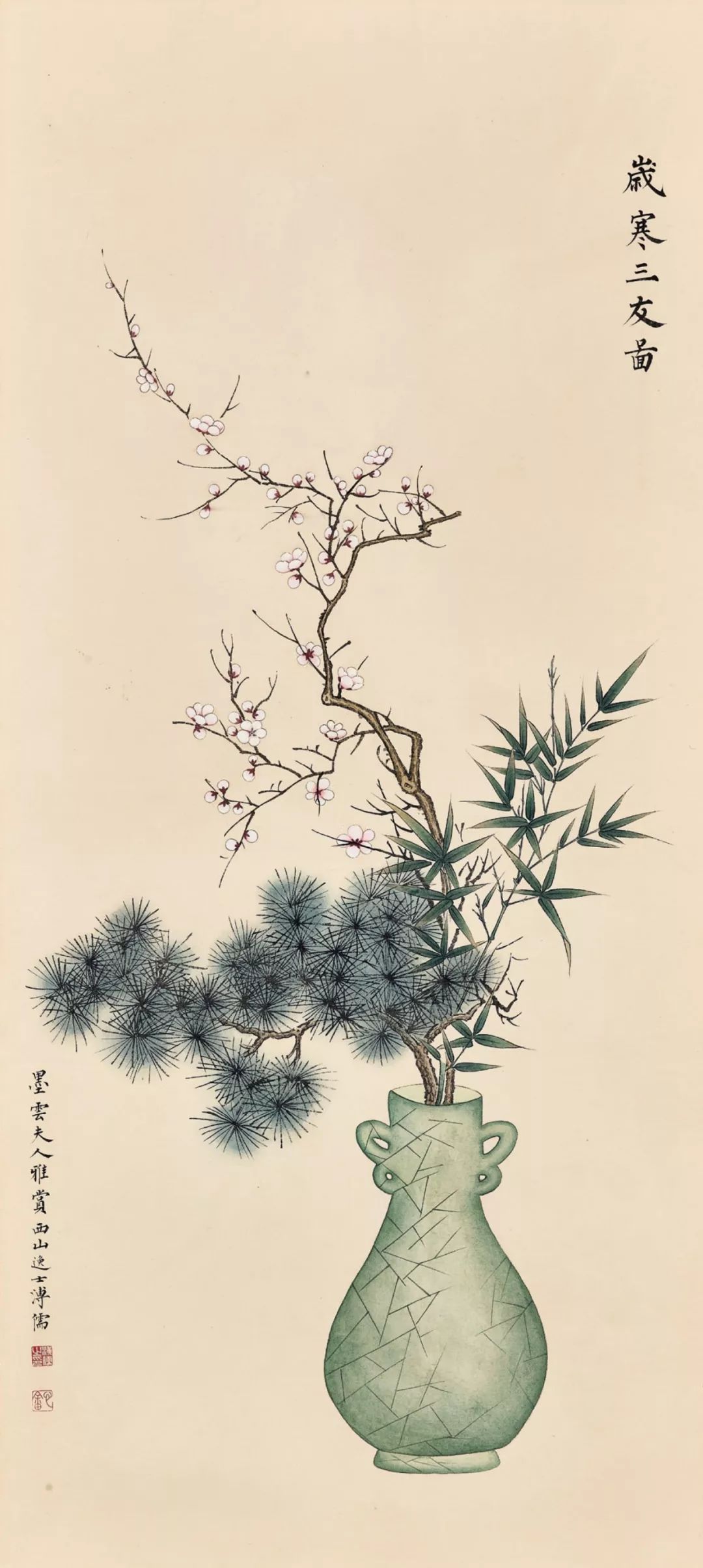 隆冬,世界一片清寒,万物尽藏,然梅红似朱砂而不谢,松挺拔树盖而亭亭,竹伫立风中而婆娑,与雪同往,与风同行,岁寒三友也。