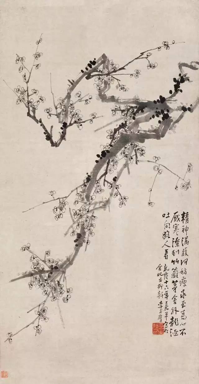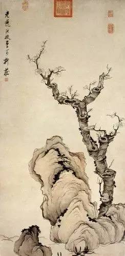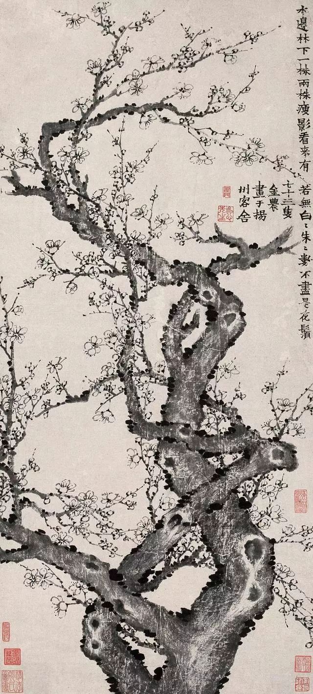 老干虬劲之姿,浓墨点苔,淡墨勾花,