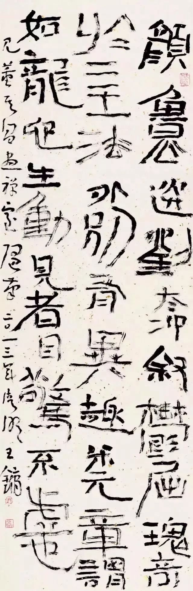 个性风格强烈,有创意,变化多,这样当然好。但这样的作品给后人取法也带来了更大的难度,对于这种风格特强烈的,还有更严重的,像金冬心的漆书,确实给我们带来了耳目一新的感觉,这种东西一学就容易像,作为一段时间内的研究可以,但是要带到自己的创作中去,就是另外一个问题了。