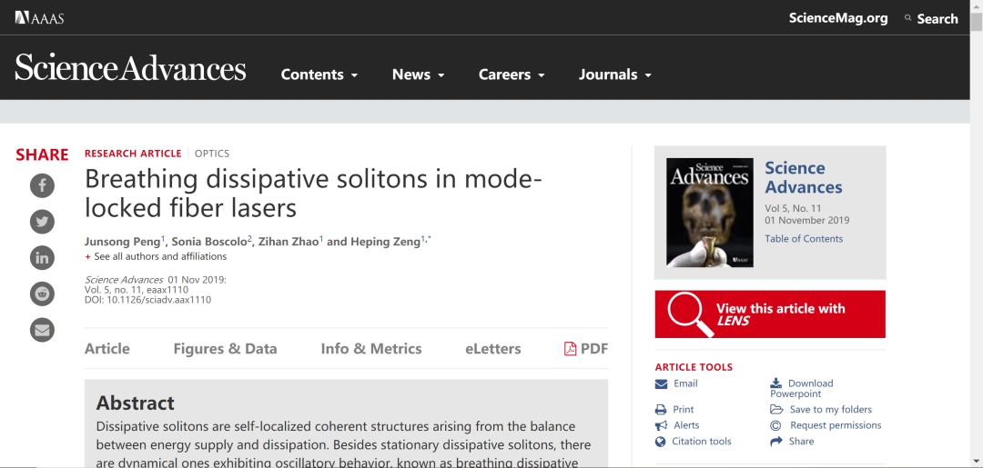 研究成果“Breathing dissipativesolitons in mode-locked fiber lasers”于2019.11月发表于《科学》(Science)杂志子刊Science Advances上。该论文以华东师范大学为第一完成单位,英国阿斯顿大学为合作单位。曾和平教授为论文唯一通讯作者,彭俊松副研究员为第一作者。