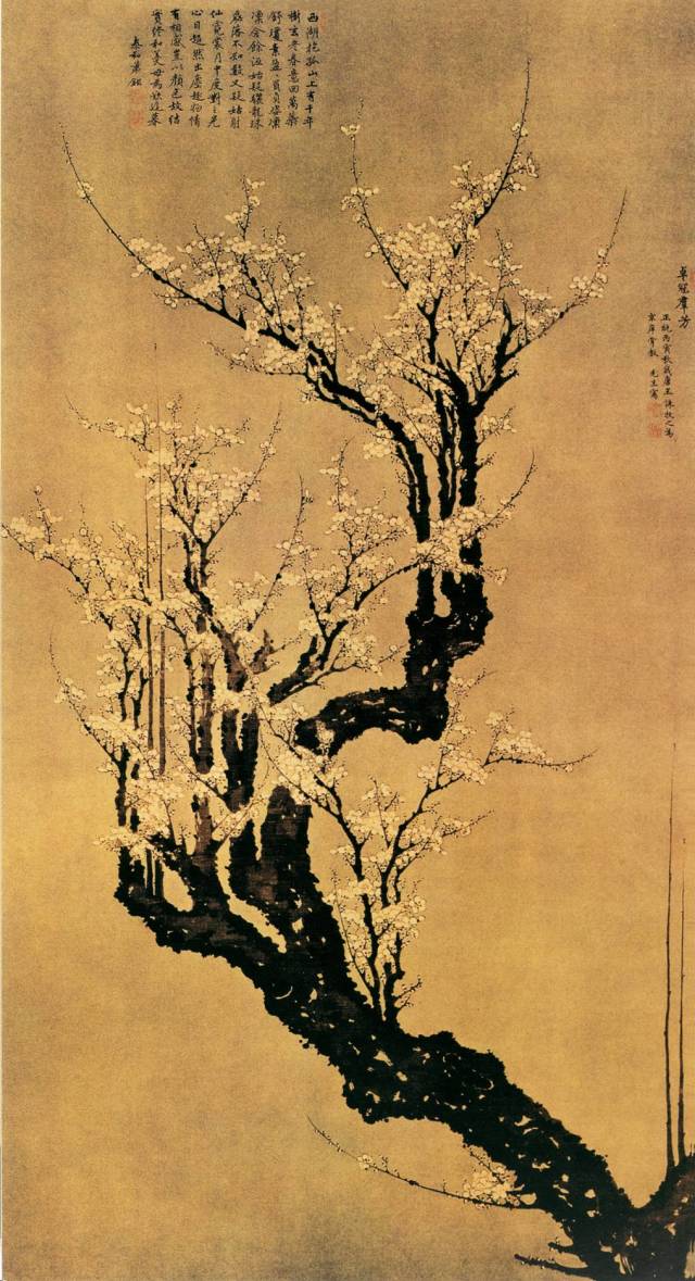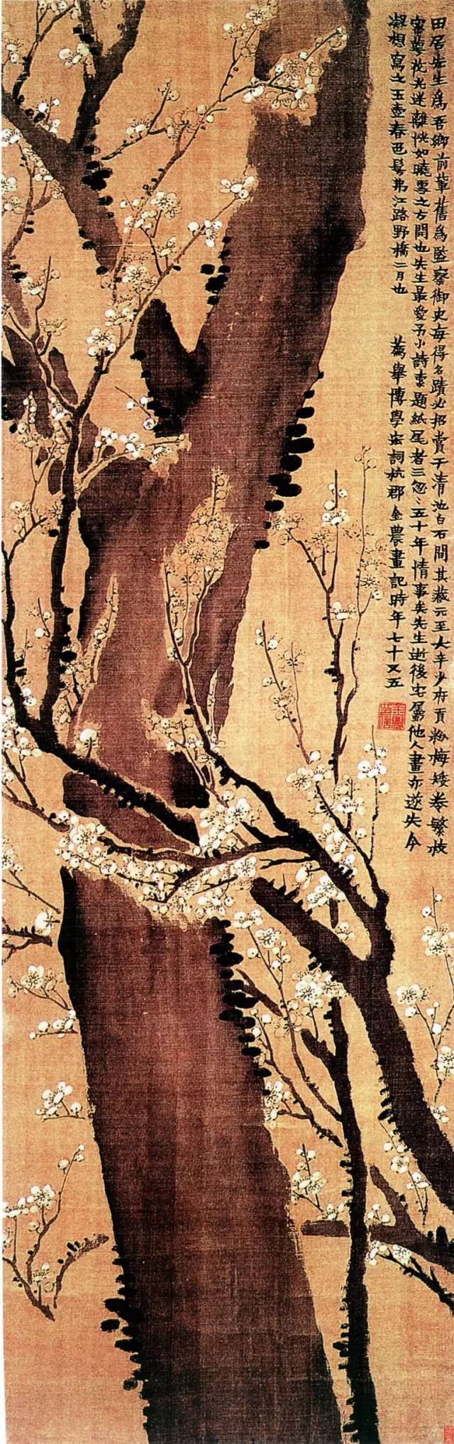 图中取梅树老干一截,通贯画幅正中,顶天立地,布局奇绝,又以大笔铺枝,小笔勾瓣,繁枝密萼,穿插左右,枝干以饱含水分的淡墨挥写,浓墨点苔,更显出老梅凌寒的性格。“花光迷离,恍如晓雪之方开”。右侧上端有作者自题,乃知为追思五十年前,观元至大辛少府贡粉矮梅卷情事,凝想而作,款署:“荐举博学宏词杭郡金农画记,时年七十又五。”此为金农老年精心之作。