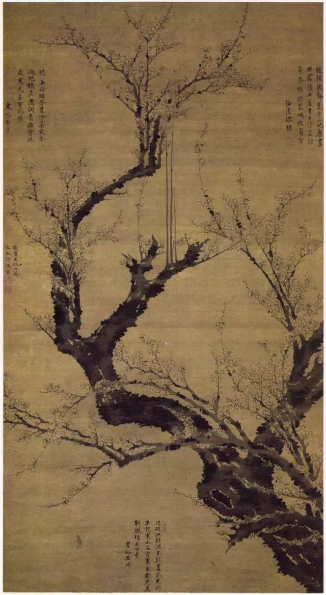 这幅梅花图与画家的《万玉图》有异曲同二之妙,但在气势上更觉恢宏。此图梅干自左出,倒垂而下,分为二枝,一枝弯曲直下,一直平伸出画面,但细枝侧条全取披垂之势,与总的动势保持一致。画面上繁花密蕊、璎珞纷呈,千条万玉,扑面而来。构图上将主干分散从而强调密如万玉的花朵本身的美感,有一种喜气洋洋的氛围,体现了画家躬逢明王朝“盛世”,而“借花献佛”,以写“梅花得意羡群芳”的心情,从而少了王冕画梅之中的那种孤傲和清雅之气。
