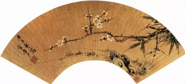 此图以较工整细致的笔法画一枝梅花与一丛翠竹,从一角斜出,垂曳于清溪之上。构图疏秀有致,梅枝盘折曲伸,指向扇面款识,使整个画面得到统一。