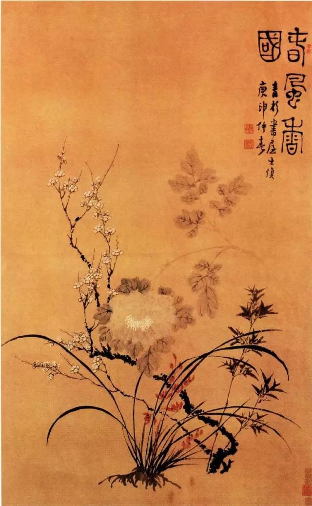 此画以梅兰竹、牡丹为题。梅花清淡秀雅,以墨笔写干,稍加点染,曲折秀逸。墨线勾花,略罩淡粉,铅白点蕊,神清韵足;中锋撇写兰叶,转折有致,以朱砂点写花冠,淡墨点心,新颖不俗。牡丹花叶以淡墨润染,钩勒花瓣罩染轻粉,晕染有湿润清丽,水气空朦之感。