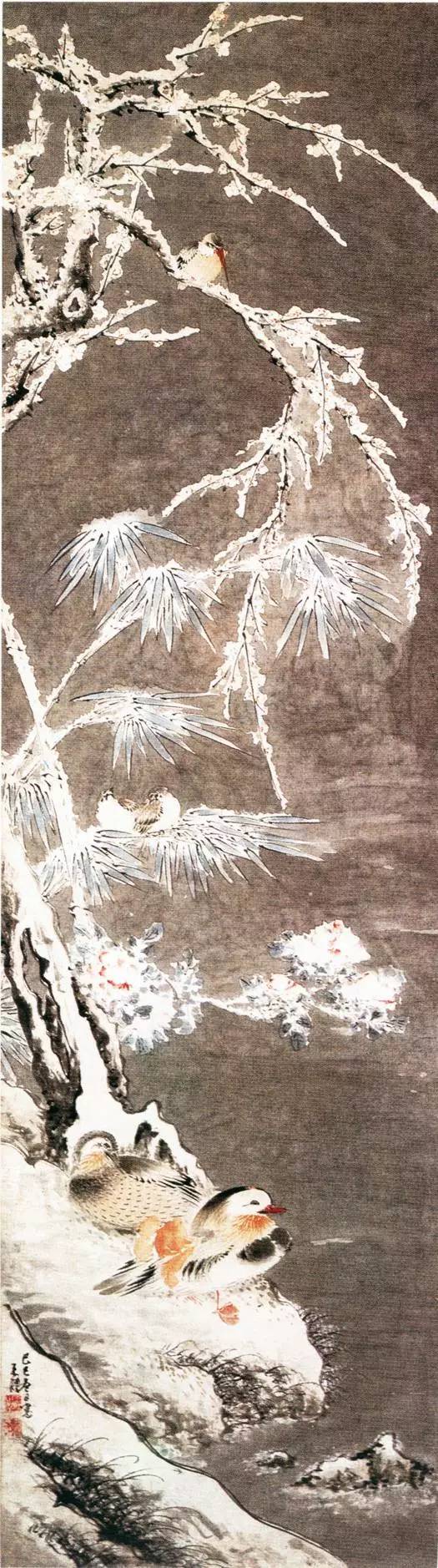 图绘雪景寒江,两只鸳鸯站岸边梳理羽毛。一株老梅,枝条繁茂,花开带雪,分外妖娆。雪竹挺立,小雀瑟栖于上。鸳鸯造型优美,色墨交融;梅树用笔老辣,用墨焦重,梅花清新淡雅,整个背景以淡墨渲染,留白以表雪意。