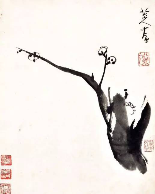 此图梅枝横斜而出,枝条简疏。枝节交叉处梅花竞相吐蕊开放,表现了王冕野梅的清绝韵致。笔墨精练蕴藉,主干以淡墨挥洒,浓墨点苔,苍古老拙。分枝以中锋勾撇,挺拔坚韧。