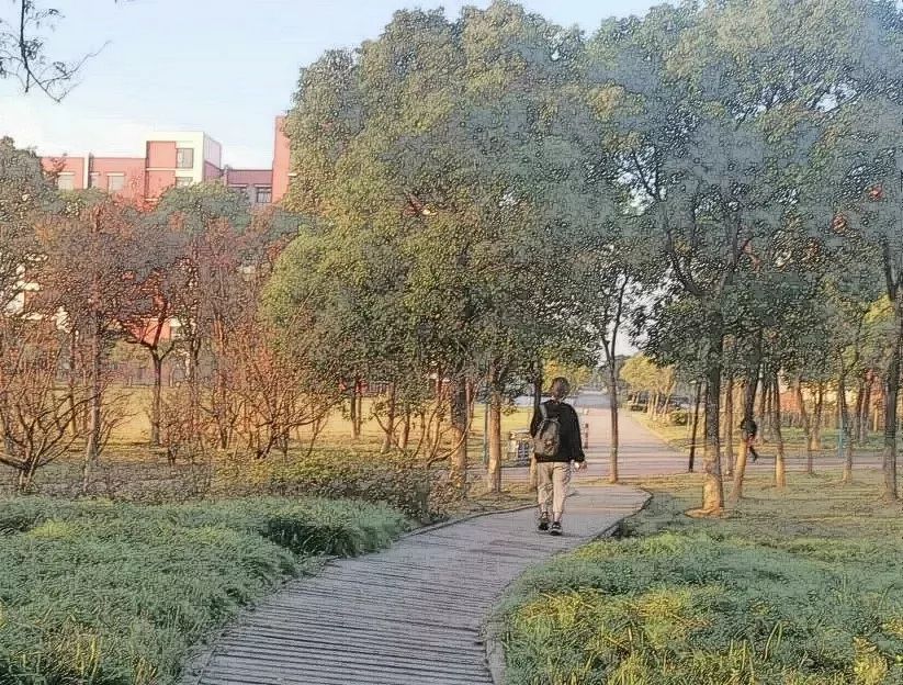 林荫小道 幽静空明 从树缝中洒下的金光照在脸上 带着希望和力量 伴我们走在前进路上