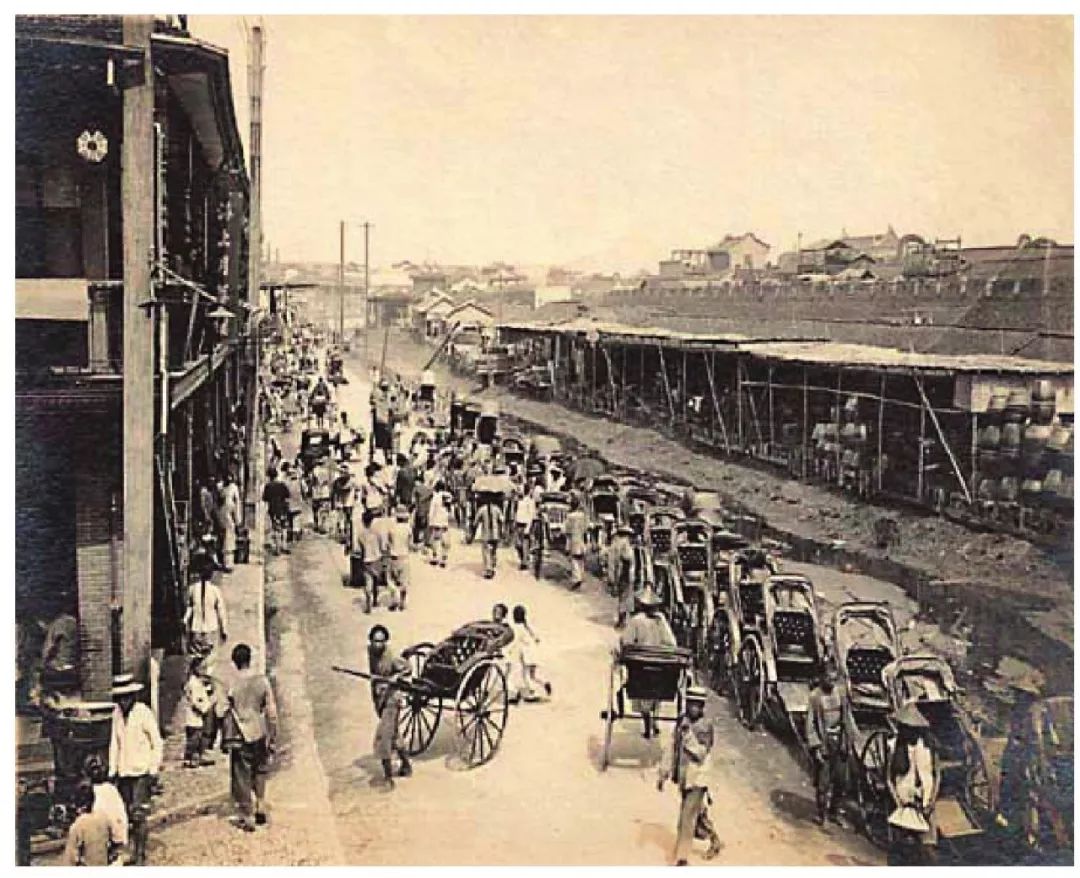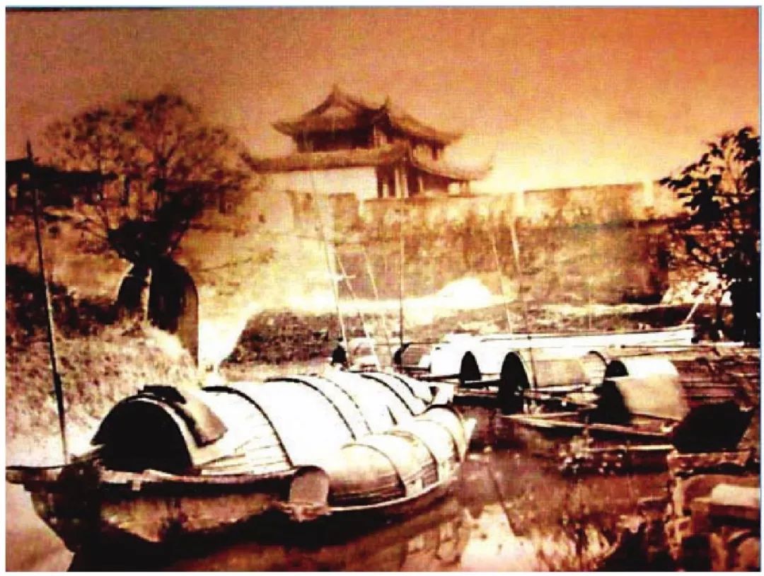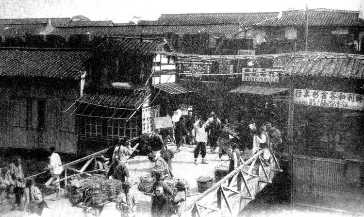 清末俯视晏海门(老北门)护城河上的木桥(日本横滨Kanamaru明信片)。供图:项慧芳。
