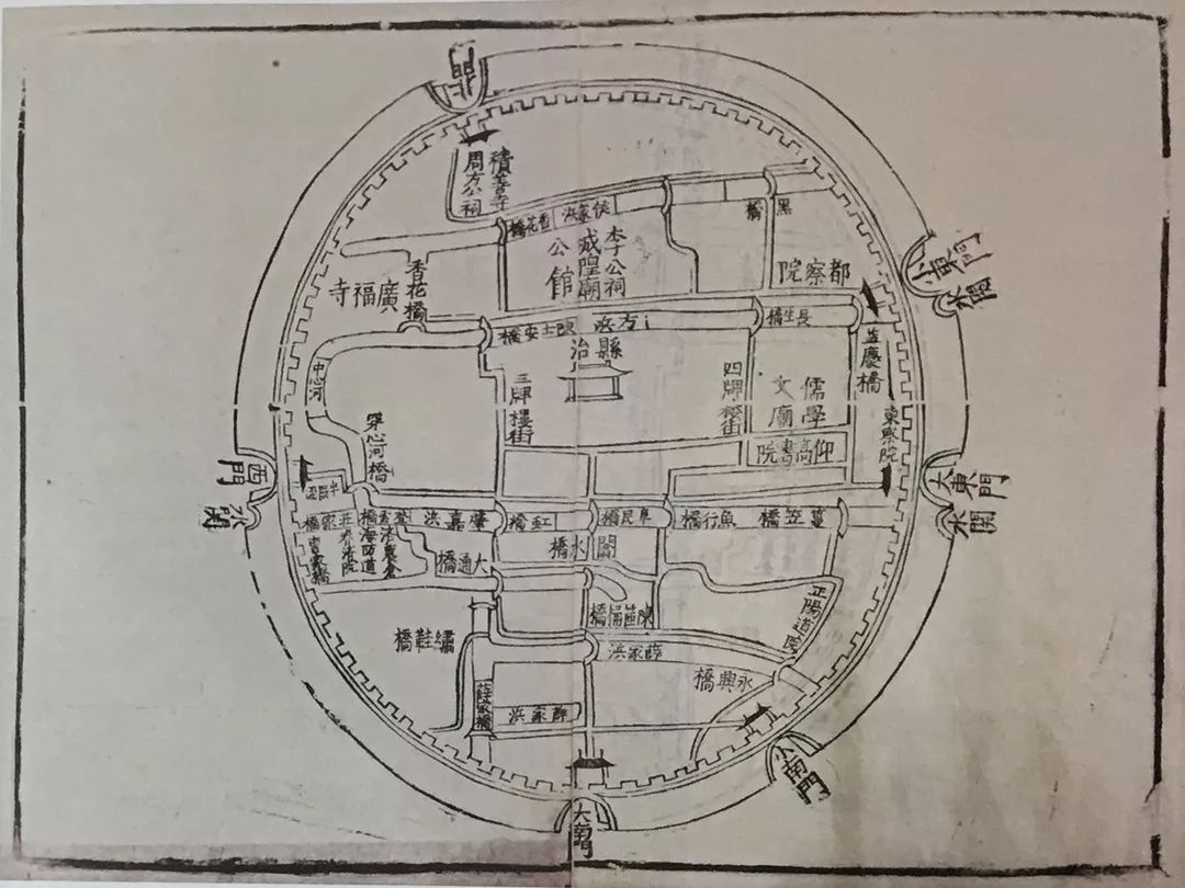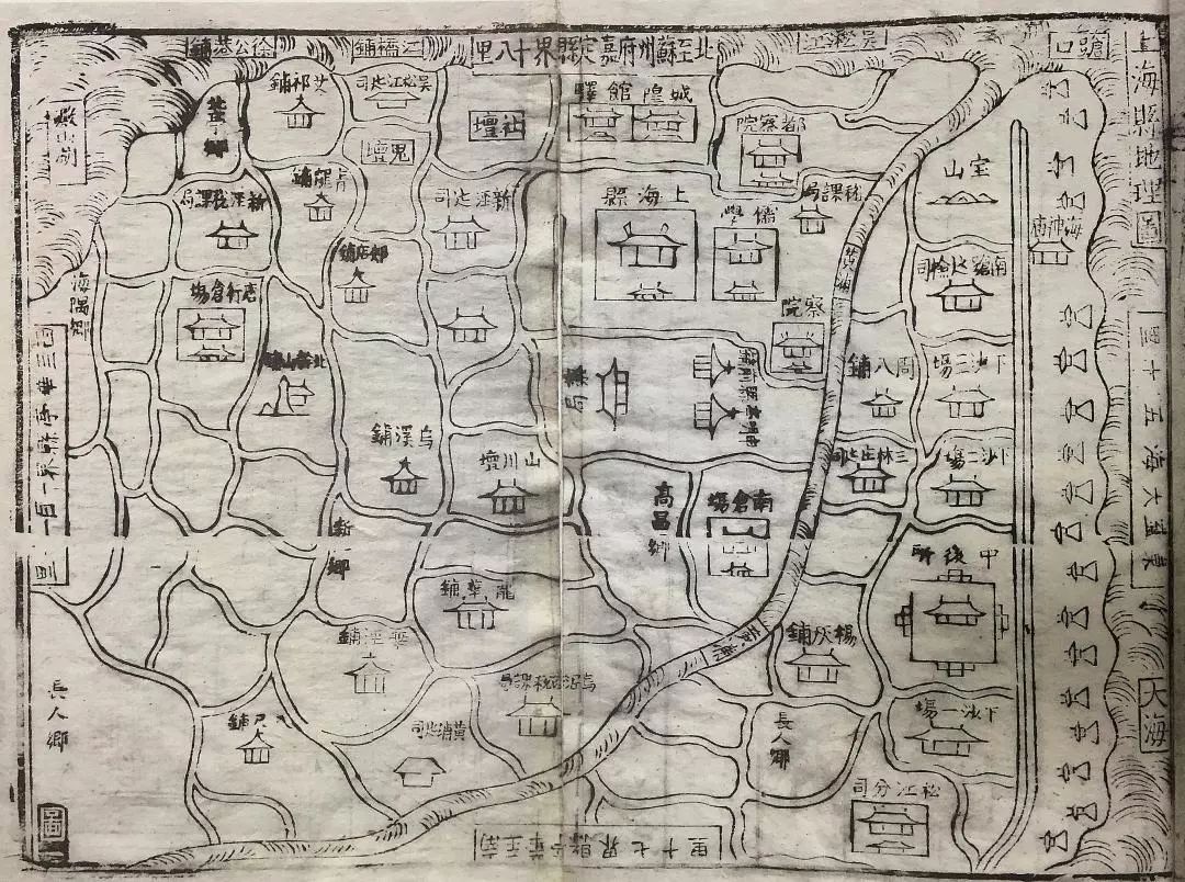 载于明弘治十七年(1504年)刊《上海志》,为现存最早的上海古地图,表现了16世纪初上海县城及县域范围。 说起修筑上海城墙,就不得不提首议筑城的顾从礼。顾从礼出生在当时上海县城内赫赫有名的官宦之家。明嘉靖三十二年(1553年),倭寇入侵上海县时,时任光禄寺少卿的他即上疏筑城,当即得到当时松江府方廉的支持,筑城经费一部分由官府拨给,另一部分为地方人士自筹。一时捐款踊跃,顾从礼个人也捐粟4000石,修筑了小南门城墙。 上海官民众志成城,仅用三个月,一座新城池在黄浦江边拔地而起,改变了上海县建县二百多年来没有城池的历史。城墙周长九里,高二丈四尺。初建的上海县城墙,辟有六座城门,即朝宗门(大东门)、宝带门(小东门)、朝阳门(小南门)、跨龙门(大南门)、仪凤门(西门)、晏海门(北门),还建有四座水门;城墙上建有万军台、制胜台、振武台以及20余个箭台;沿城墙开挖有护城河。