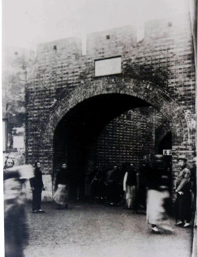 清末拱辰门,又称小北门 清宣统三年(1911年),辛亥革命的一声枪响,腐朽的清王朝终于落下帷幕,上海光复。姚文栅等人看到拆除上海老城厢城墙的曙光。于是再次联名上书给时任沪军都督府民政部长的李平书,当即得到批准。李平书大声疾呼:“今日时机已至,欲拆则拆,失此时机,永无拆墙之望矣!” 很快为拆除城墙而设立的“城壕事务所”在大境阁关帝殿成立了。当时的拆城墙并无精准的定向爆破,也无强力的大型破拆机械,只有人力锤镐、手工钎凿,以及四野乡民的锄头铁搭。当时拆下的砖瓦当即用于填入早已废弃的护城壕沟,填筑了今天的人民路(当时为“法华民国路”,1949年后更现名)、中华路。而大境阁关帝殿这段城墙因当年设立的“城壕事务所”而意外地保留下来了。
