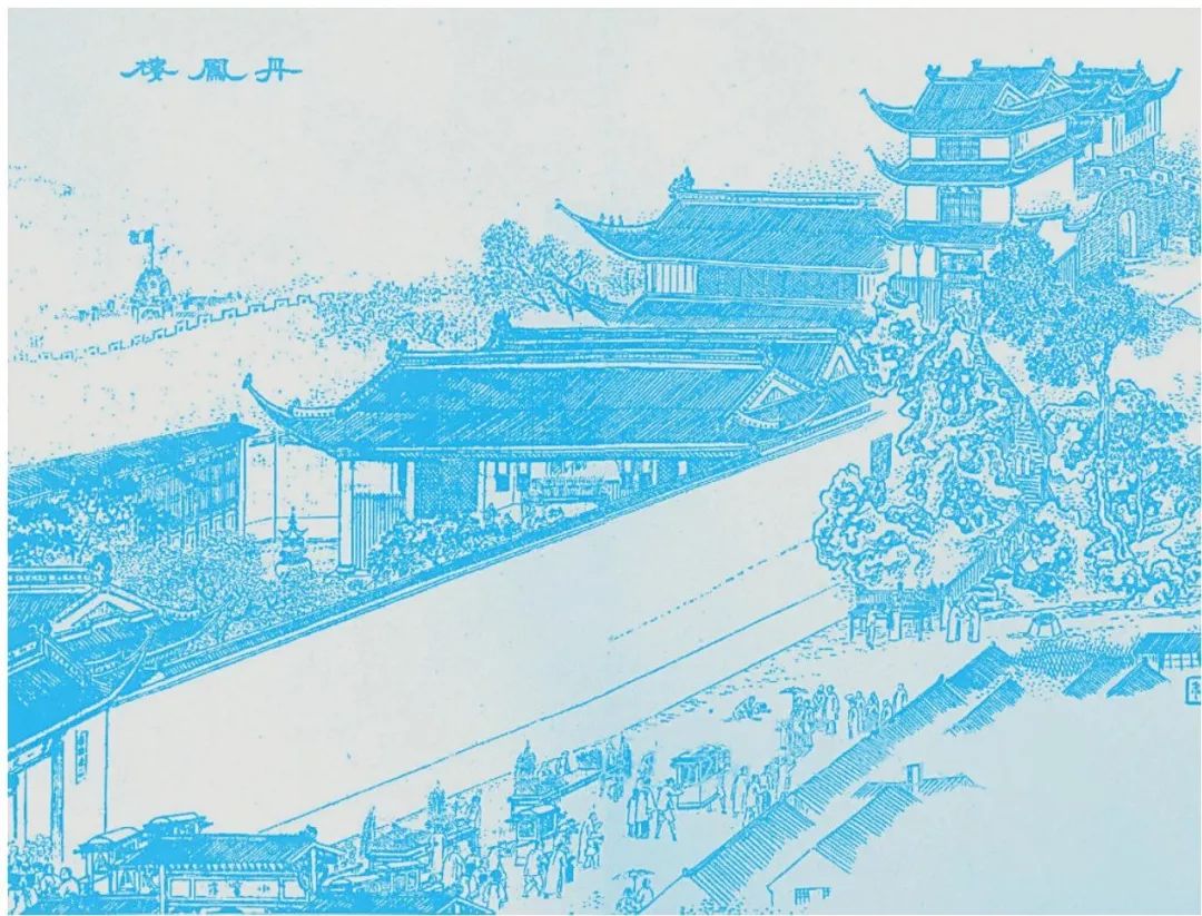而丹凤楼早在南宋就有,是当时天后宫内的一座楼,上海镇市舶司使陈珩为其书匾,然而至元末楼毁匾存。明万历初年,有人建议将丹凤楼重建于万军台上,并将陈珩之匾额献出。由于丹凤楼是“殿、台、楼、阁”中最高的一座,登楼远眺黄浦江、端午登高观赏大赛龙舟的最佳地点,于是“凤楼远眺”就被列为“沪城八景”之一。