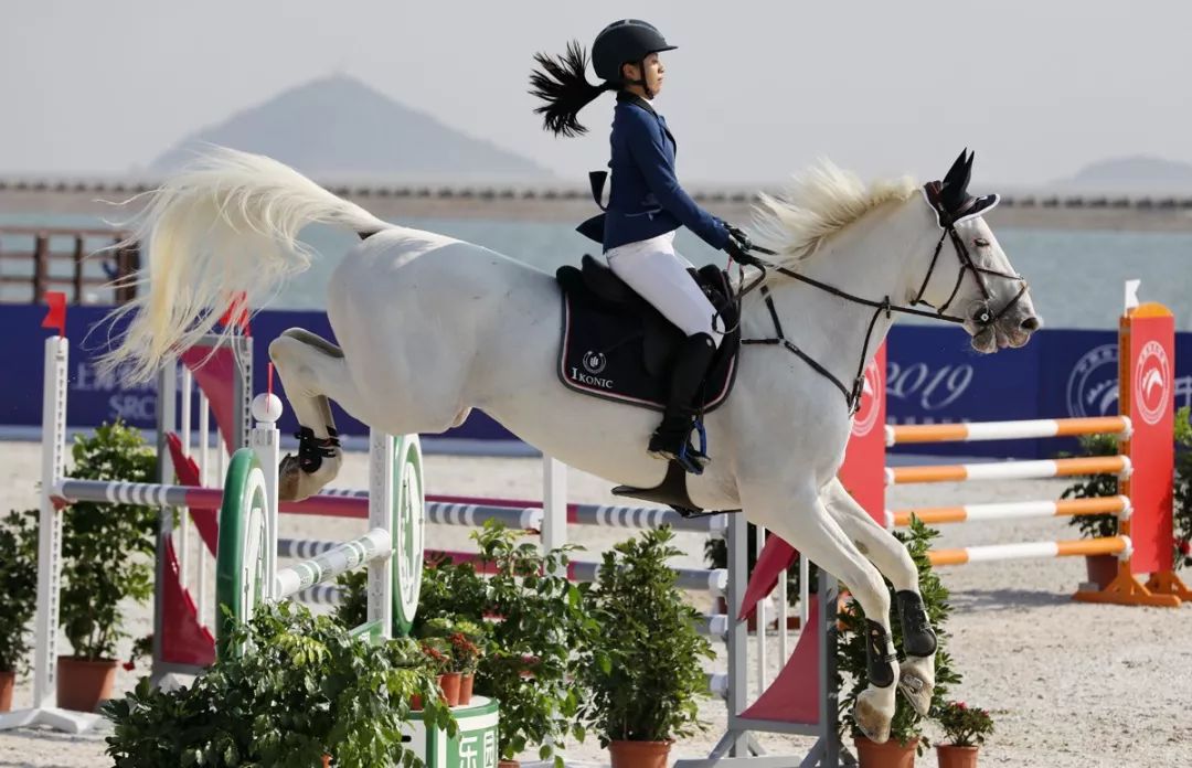 2019年12月15日,上海金山国际马术场内,参加全国马术场地障碍锦标赛的选手和马匹与其背景中的“金山三岛”相映成趣 图片摄影 | 庄毅