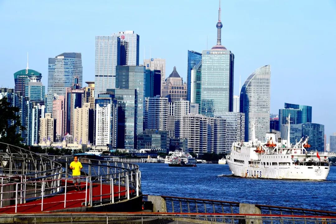 2019年8月11日,市民在黄浦江洋泾段滨江岸线晨跑, 背景中是高楼林立的陆家嘴 图片摄影 | 茅正元