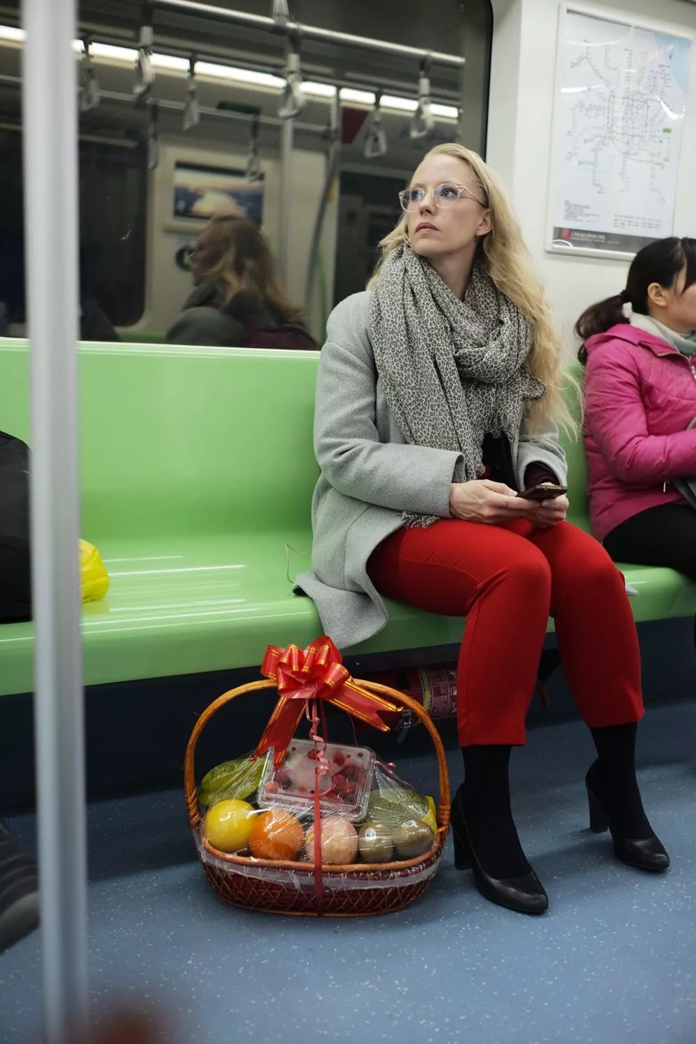 2019年2月4日,除夕傍晚,轨道交通12号线上一名“外国新妇”入乡随俗,提着水果篮走亲戚 图片摄影 | 崔铁军
