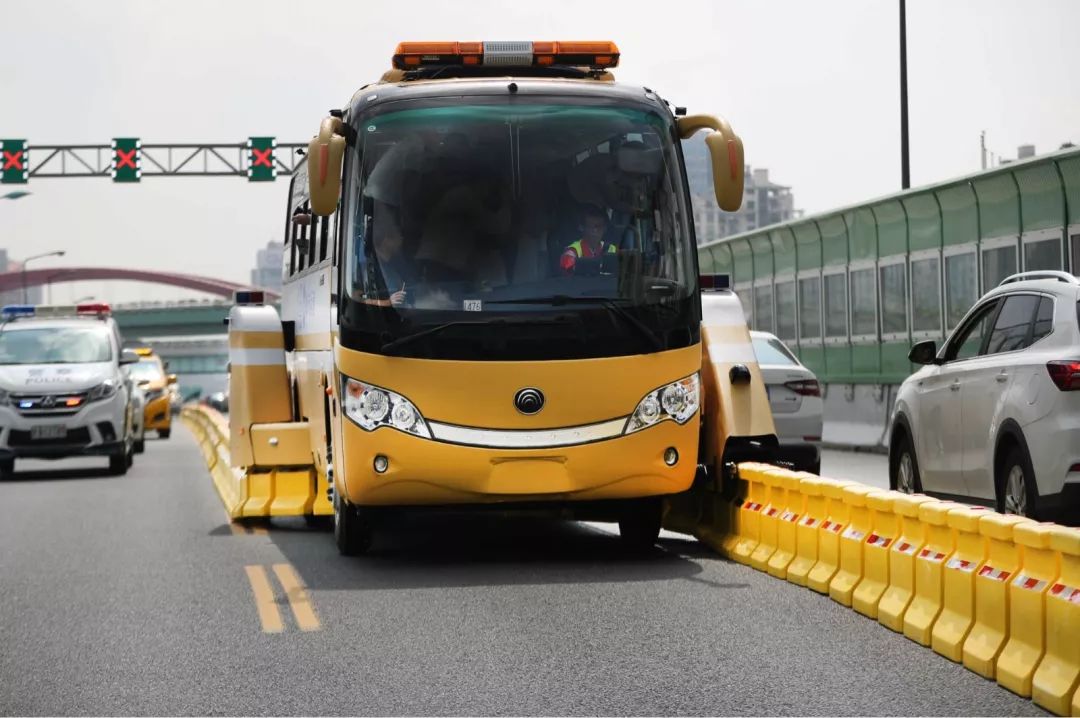 2019年9月28日,随着一辆“拉链车”在沪闵高架开启作业,上海市首个“拉链式潮汐车道”正式运行。此举是为了提高行车安全,避免车辆误入对向车道,在原有标线和可变屏的基础上增加物理隔离栏 图片摄影 | 赵立荣