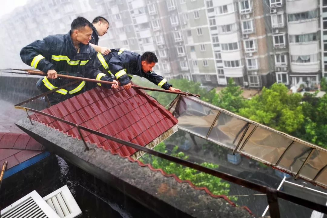 2019年8月10日,受台风“利奇马”影响,徐汇区罗锦路800弄内一处居民楼户外遮阳板在风中摇摇欲坠,随时有掉落的危险。梅陇消防中队指战员及时赶到现场处置,排除隐患 图片摄影 | 赵立荣 唐郁
