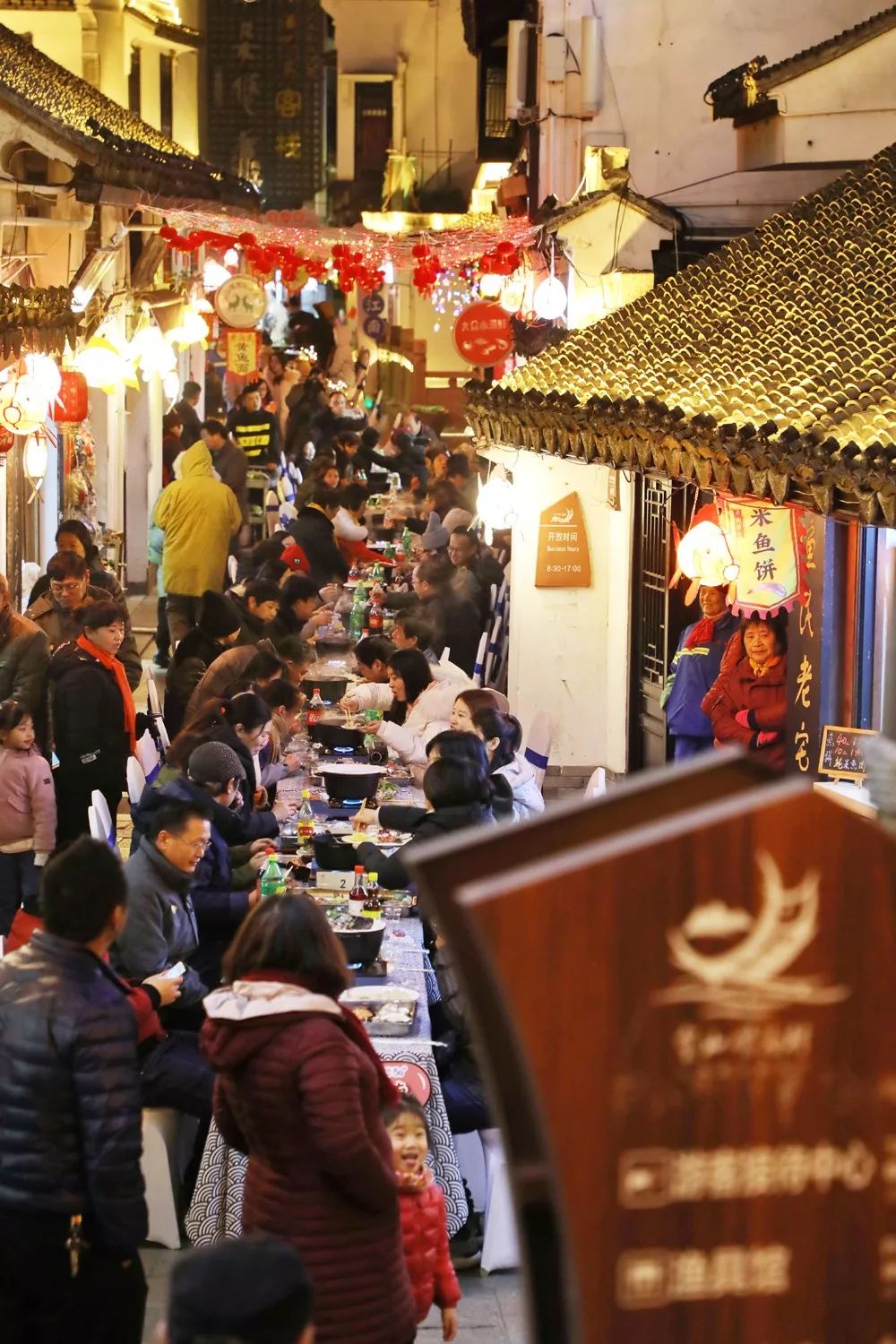 2019年12月31日,金山嘴渔村老街上摆起百米长桌海鲜火锅宴,百余名游客和当地居民围坐一起,品尝渔村特有的海鲜老八样火锅,其乐融融 图片摄影 | 庄毅