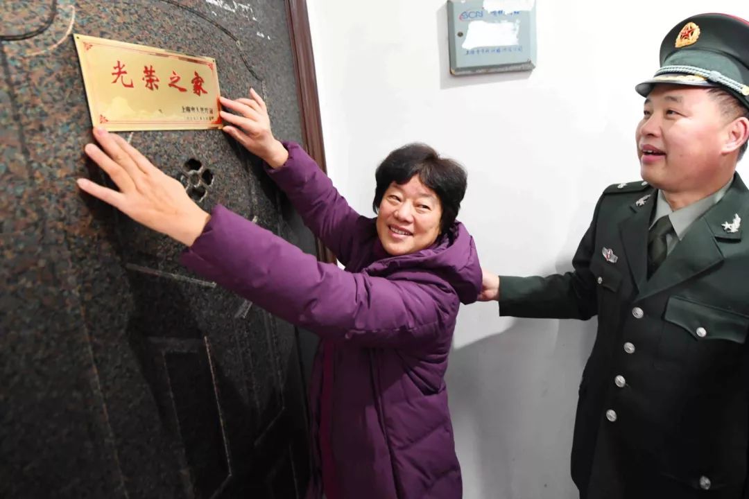 2019年2月18日,松江区岳阳街道烈士家属和区武装部干部一起在自家门口挂出“光荣之家”铭牌 图片摄影 | 赵立荣