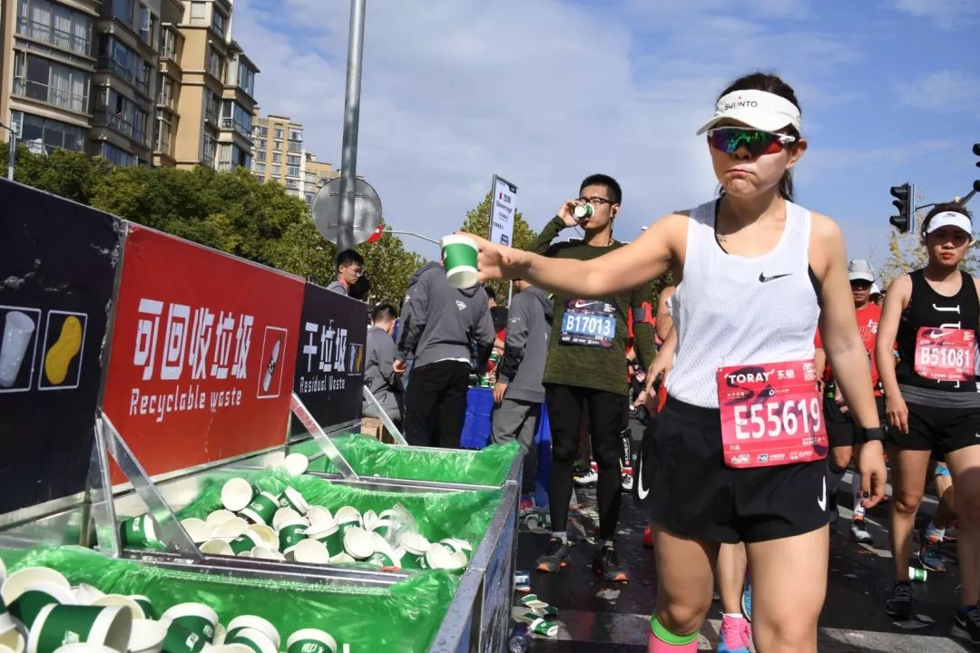 2019年11月17日,一年一度的“上海国际马拉松赛”举行。为贯彻《上海市生活垃圾管理条例》,主办方首次在跑道沿线放置垃圾分类回收箱,供参赛运动员分类投放 图片摄影 | 赵立荣