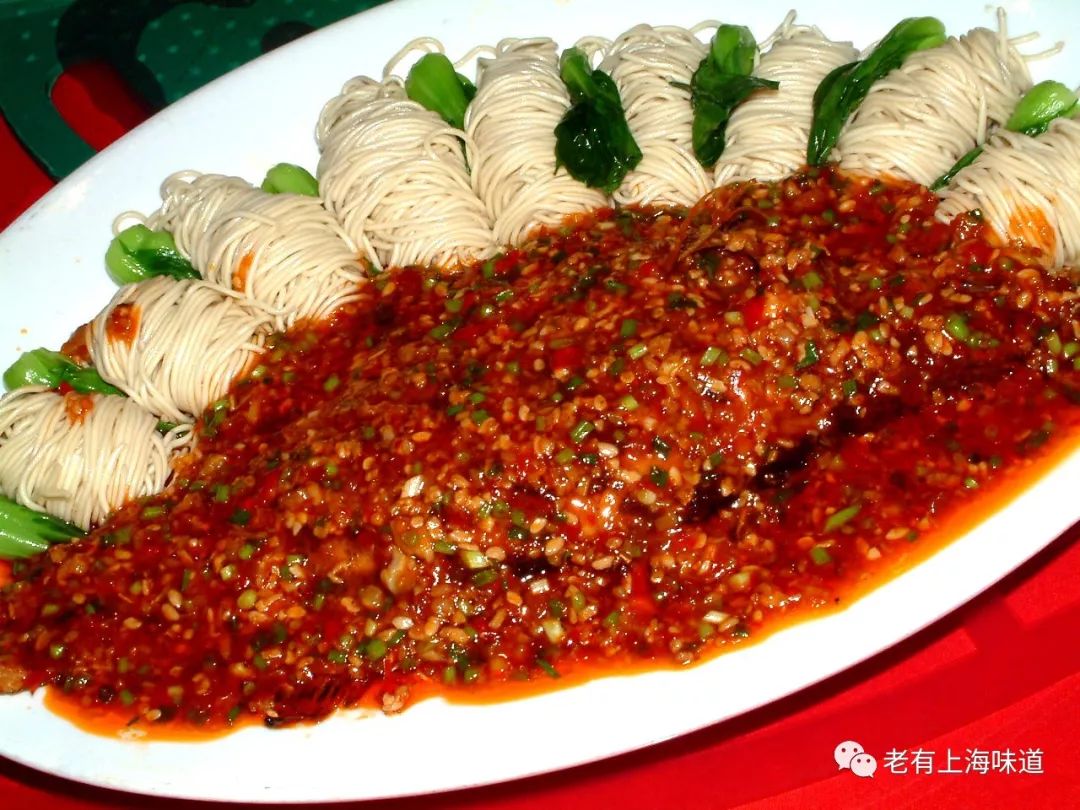 比如明虾两吃,虾段留尾巴串成麻花状滑炒,虾头拍粉油炸椒盐,一嫩一脆,下酒妙品。富贵鱼镶面,色泽红亮,喜感十足,由“骨灰级”的干烧鲫鱼演化而来,但食材改为江南看重的鳜鱼。又取面条煮熟后打成八至十个卷,排列在鳜鱼周围,客人吃了整鱼后,留下的卤汁正好拌面吃。当年虞经理请我与长春朋友吃后,朋友击节叫好,称此菜体现了“上海人的精明大气”。还有小煎鸡米、炝虎尾、川味砂锅大鱼头等,原本都是淮扬菜,与川菜合流后便有麻辣味的参入,味觉呈现也丰富多了。现在梅龙镇和绿扬邨都不大宣称自己是“海派”了,但“海派”两字的时代印记是难以磨灭的。其实不必担心“海派”两字会损害老字号的声誉,它应该是加分的。)