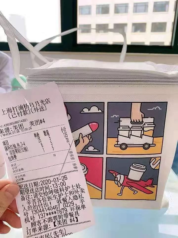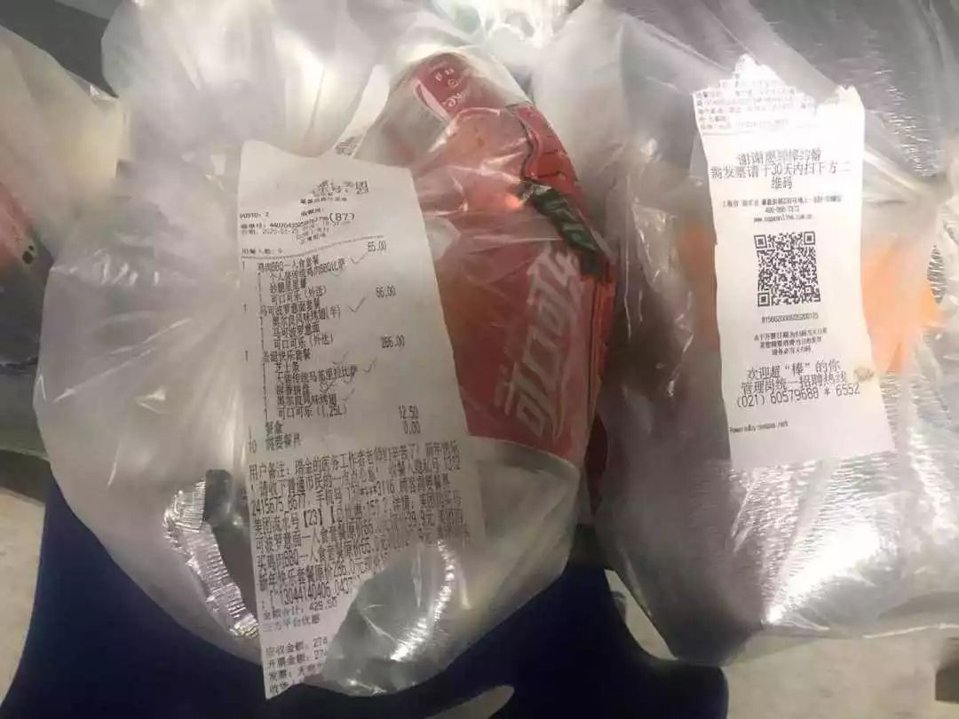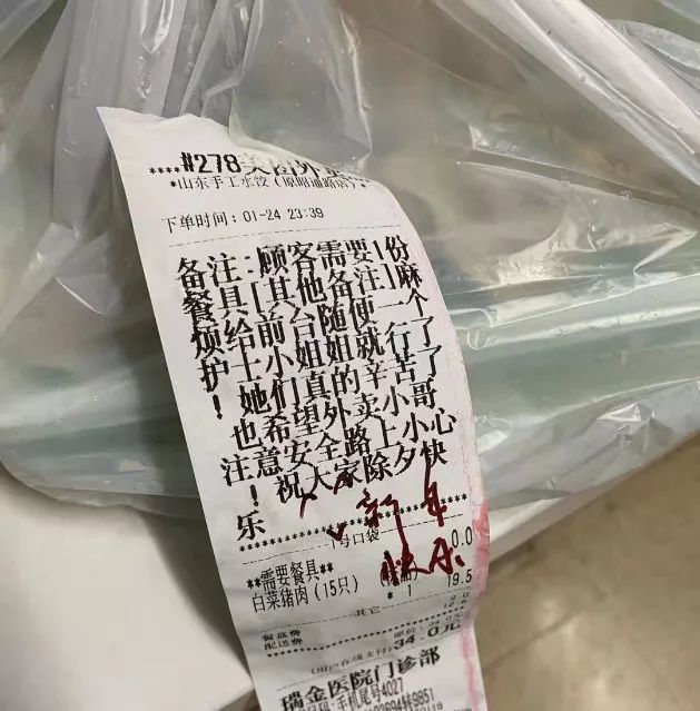 1月25日大年初一晚上9点多,一份整整三大包的外卖餐食被送到上海交通大学医学院附属瑞金医院呼吸科病房。送餐单上没有留下电话和姓名,留言栏写着:“瑞金医院医务工作者老师们辛苦了!新年快乐!请收下普通市民的一点心意!”。