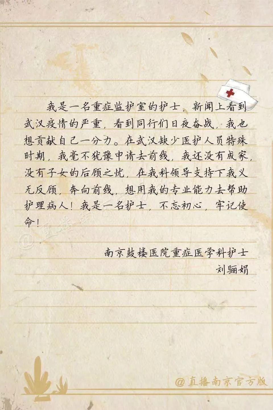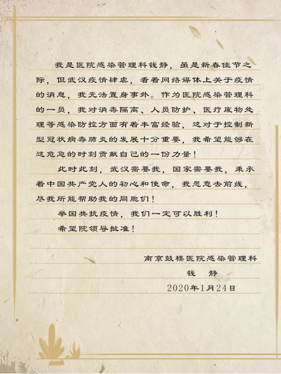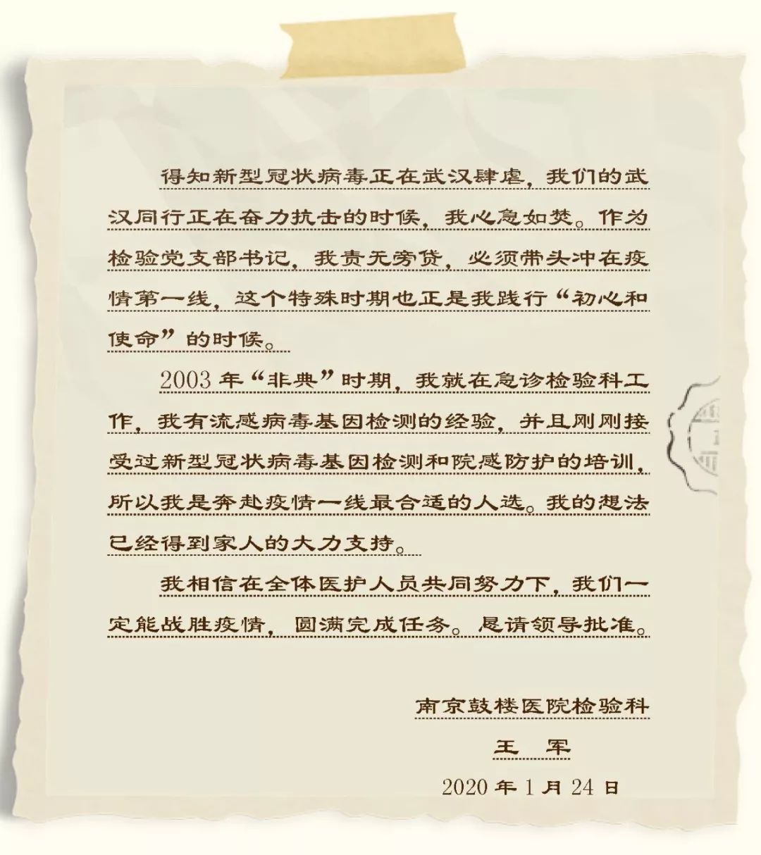 “此时此刻,武汉需要我,国家需要我,秉承着中国共产党人的初心和使命,我愿意去前线,尽我所能帮助我的同胞们。举国共抗疫情,我们一定可以胜利!”