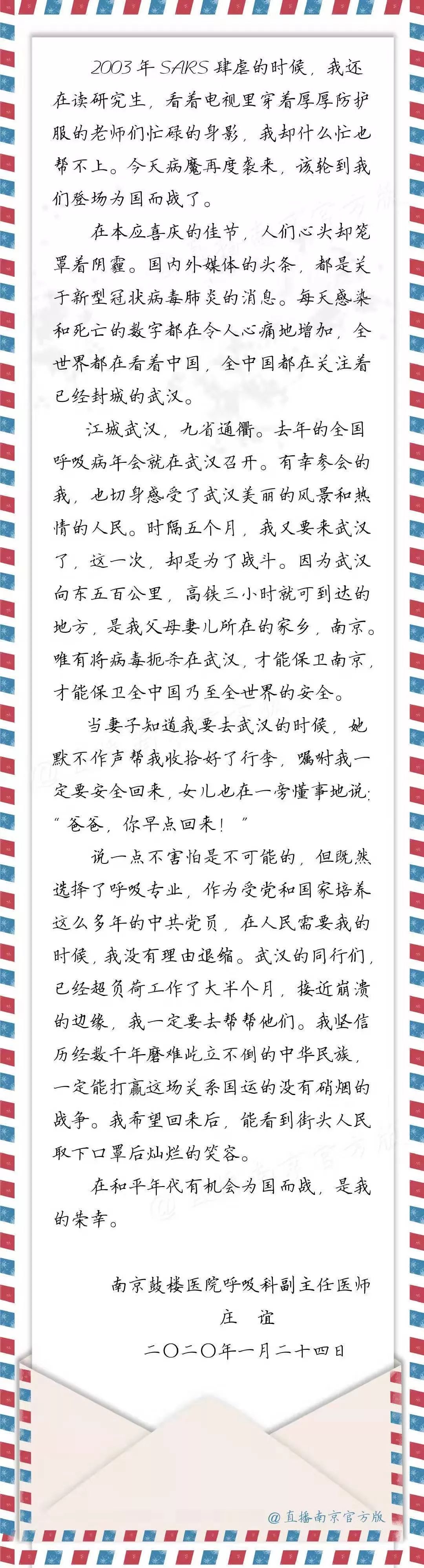 “因为武汉向东五百公里,高铁三小时就可到达的地方,是我父母妻儿所在的家乡,南京。唯有将病毒扼杀在武汉,才能保卫南京,才能保卫全中国乃至全世界的安全。”