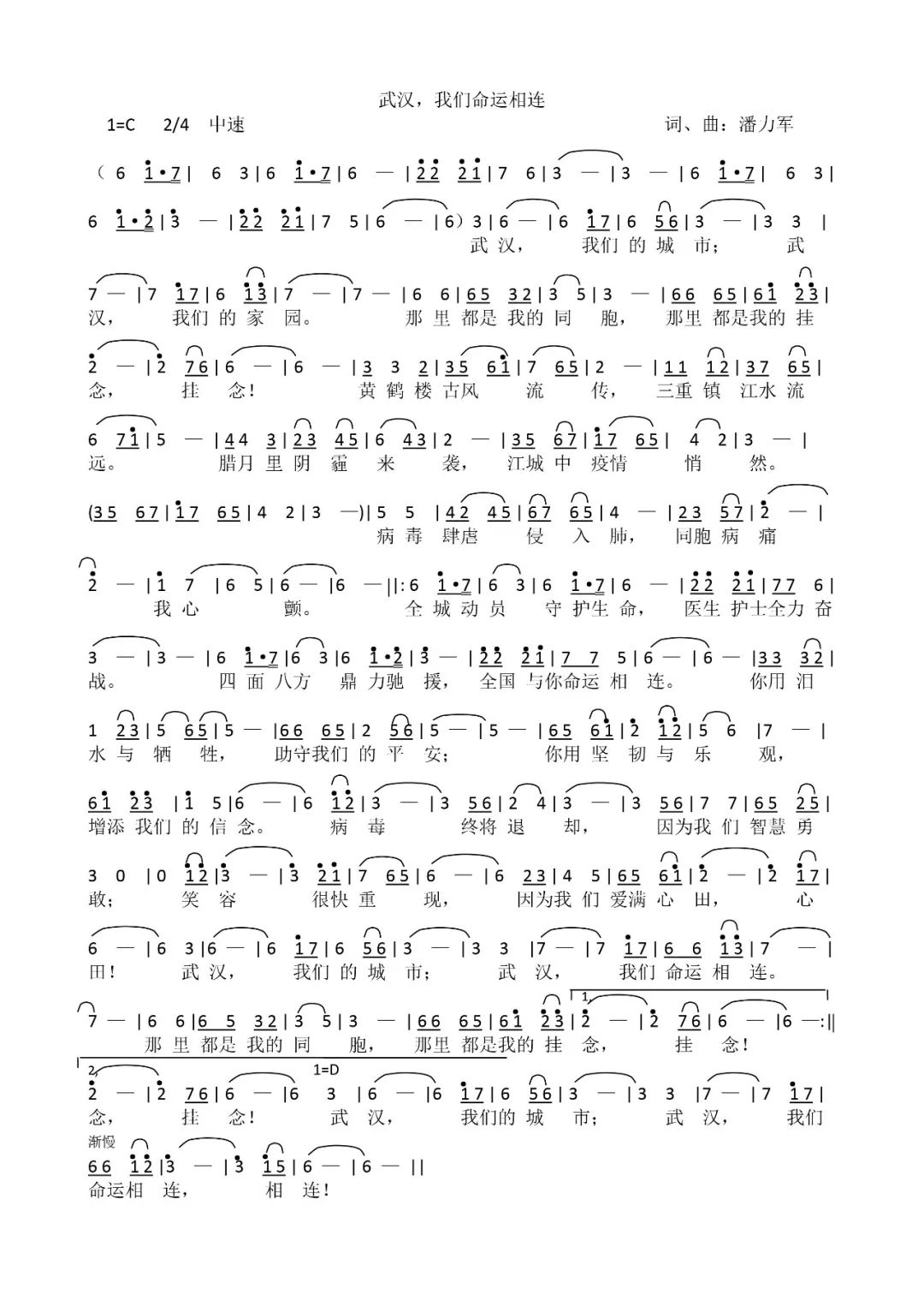 武汉,我们命运相连 武汉,我们的城市;武汉,我们的家园。 那里都是我的同胞,那里都是我的挂念! 黄鹤楼古风流传,三重镇江水流远。 腊月里阴霾来袭,江城中疫情悄然。 病毒肆虐侵入肺,同胞病痛我心颤。 全城动员守护生命,医生护士全力奋战。 四面八方鼎力驰援,全国与你命运相连。 你用泪水与牺牲,助守我们的平安; 你用坚韧与乐观,增添我们的信念。 病毒终将退却,因为我们智慧勇敢; 笑容很快重现,因为我们爱满心田,心田! 武汉,我们的城市;武汉,我们命运相连。 那里都是我的同胞,那里都是我的挂念! 全城动员守护生命,医生护士全力奋战。 四面八方鼎力驰援,全国与你命运相连。 你用泪水与牺牲,助守我们的平安; 你用坚韧与乐观,增添我们的信念。 病毒终将退却,因为我们智慧勇敢; 笑容很快重现,因为我们爱满心田,心田! 武汉,我们的城市;武汉,我们命运相连。 那里都是我的同胞,那里都是我的挂念! 武汉,我们的城市;武汉,我们命运相连,相连! 加油,武汉!