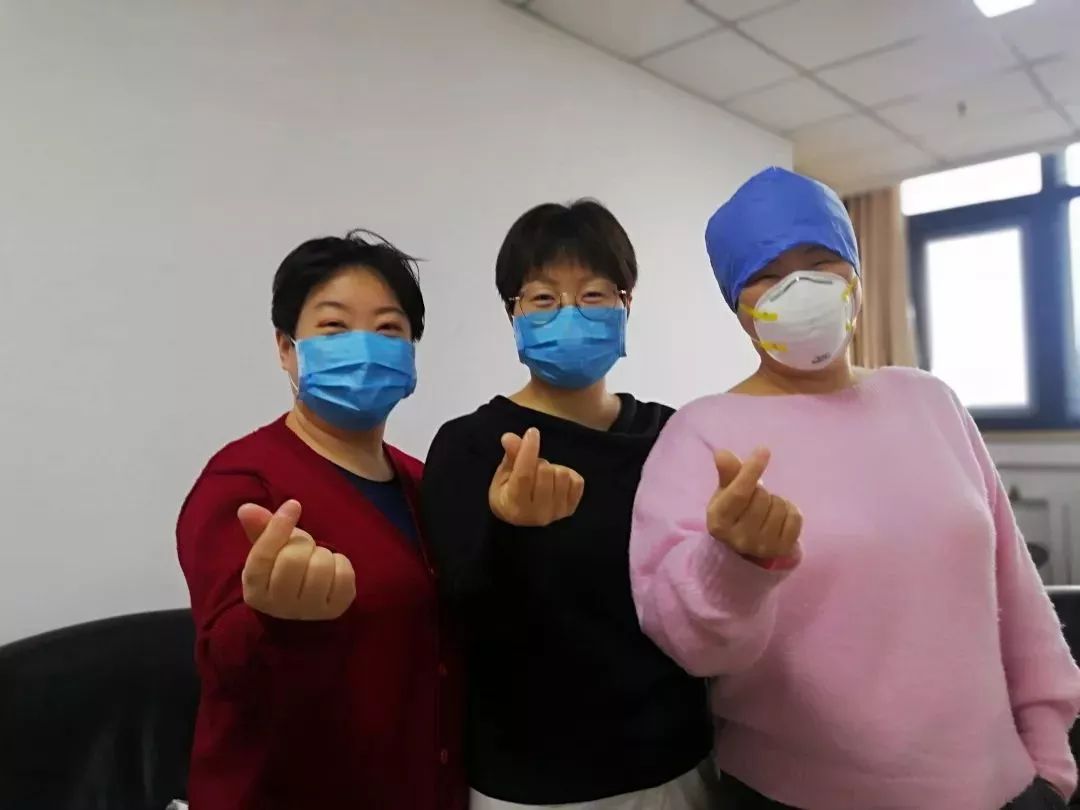 贾英华、张肖南、陈希防护训练之余“比心”留影