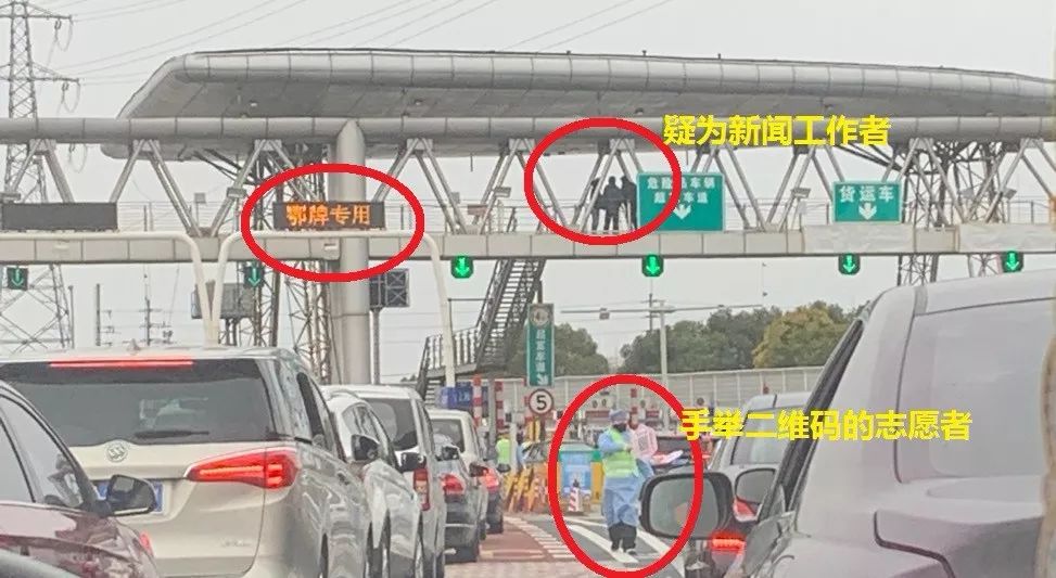朱桥站的车流量通常是所有省接道口中最大的,据说为了减少排队时间,这次又增加了4条检查车道。 车道上方的天桥上还行走着几个拿相机的新闻工作者,偶尔有闪光灯闪烁,想来是要及时报道高速路口的防疫查控情况。 目之所及有警察、医务人员和志愿者,紧张有序地指挥车辆、测量体温。志愿者举着二维码穿梭在长长的车队之间,数百米外就开始挨个提醒入沪车辆,在排队等待的同时扫码填写“来沪人员健康登记”的相关信息,以提高道口通行效率。