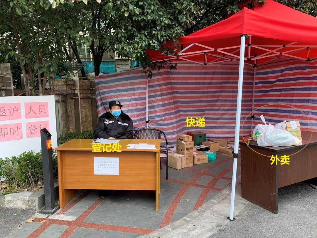物业保安挨个检查了体温,又请我们到一旁登记。小区大门旁边临时搭建了一个简易的棚,棚下摆放了两张桌子,一张供返沪居民填写登记表格,另一张放着陆续“无接触配送”来的外卖。