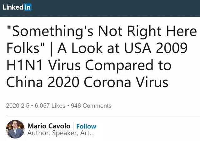 近日,一位在中国生活了近20年的意大利裔美国人马意骏(Mario Cavolo)在社交媒体上撰写题为《各位,有点儿不对劲:对比美国2009年的H1N1病毒和中国2020年的冠状病毒》的文章引起不少网友关注。
