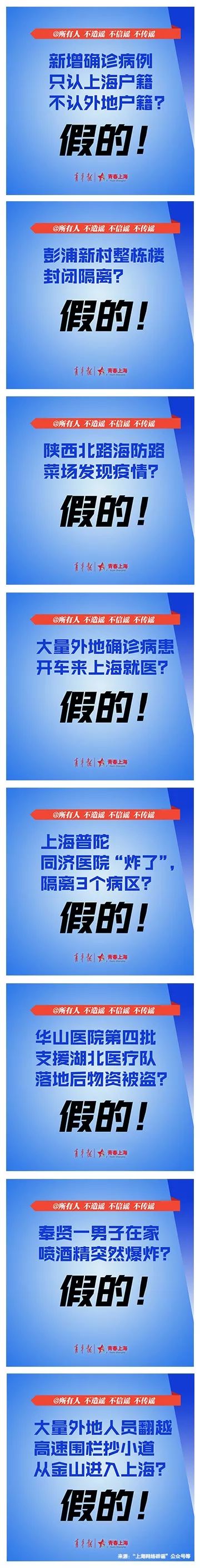 这两天,上海部分企业迎来复工,返程人流升温,上海“守门”护城压力不小。尽管上海新增确诊病例明显下降,让大家对击败疫情增添了信心,但恰在这个时刻,有一些谣言却跑出来招摇捣乱,譬如“新增确诊病例只认上海户籍不认外地户籍”“华山医院支援湖北医疗队落地后物资被盗”等等,不一而足,给大家卯足劲的防疫之心添了堵,让市民们更担心了。