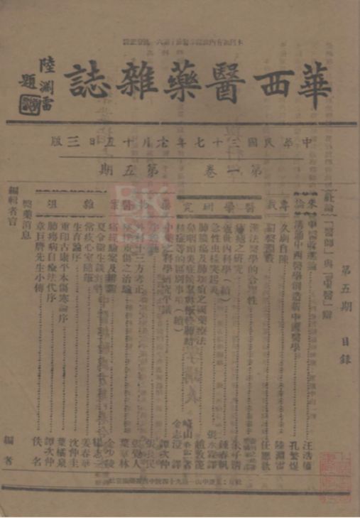 民国时期是我国医学发生重大变革的特殊时期。受近代西学东渐思潮的影响,西方医学和中国传统医学两种医学体系在这一时期产生了激烈的碰撞。 这一时期,涌现出了大量医学类期刊,如《中西医学报》、《中华医学杂志》、《社会医报》、《医界春秋》、《同德医学》、《大众医学月刊》、《华西医药杂志》、《医潮》、《医育》、《医学导报》、《医学周刊》、《医学与药学》、《民生医药》、《卫生报》……