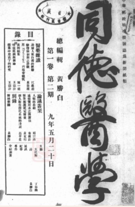 图片来源:《同德医学》,1920年/第1卷/第2期1920年4月创刊于上海,由同德医学月刊社编辑,同德医学专门学校发行,主编为黄胜白,1923年4月起改名为《同德医药学》,馆藏1920年至1923年完整卷号。