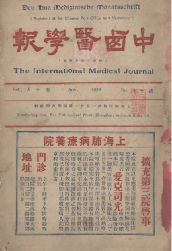 图片来源:《中西医学报》,1929年/第10卷/第1期1910年4月,创刊于上海,译名为“The International Medical Journal”,主要创办人是丁福保、顾鸣盛等,由中西医学研究会出版并发行。该刊以研究中西医药学、交流知识、振兴医学为宗旨,提倡用近代科学方法研究中医,提出了“以中学为本、西学为辅”的理念。 《中西医学报》是近代重要医学刊物,刊载了大量反映清末至民国中西医学发展状况的文章,是研究中国近代医学发展的重要资料。
