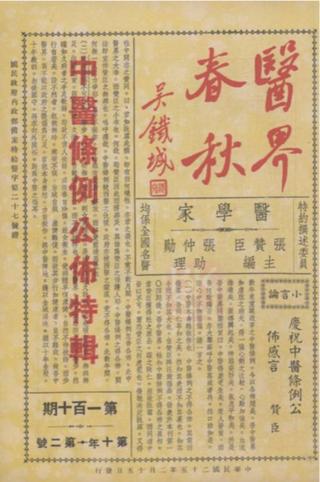 1926年5月创刊,由上海医界春秋社发行,至1937年3月因日本侵入而停刊,持续时间达11年之久,是近代中医史上持续时间较长、影响较大的中医医学刊物。《医界春秋》以“探讨医学,不分中西,只重效果”为宗旨。载文主要介绍中医医学,并比较中西医优缺点,发扬中国医学。 该刊以反应敏锐、立论谨慎、内容活跃著称,贯穿于中西医论争激化的大部分时期,是当时中医界维护中医合法地位的重要阵地。在中西医论争时期,《医界春秋》在社会舆论方面起着重要的导向作用,是中医界团结自身、争取舆论的有力工具,为维护中医学术地位,发展和振兴中医做出了重要的贡献。 )