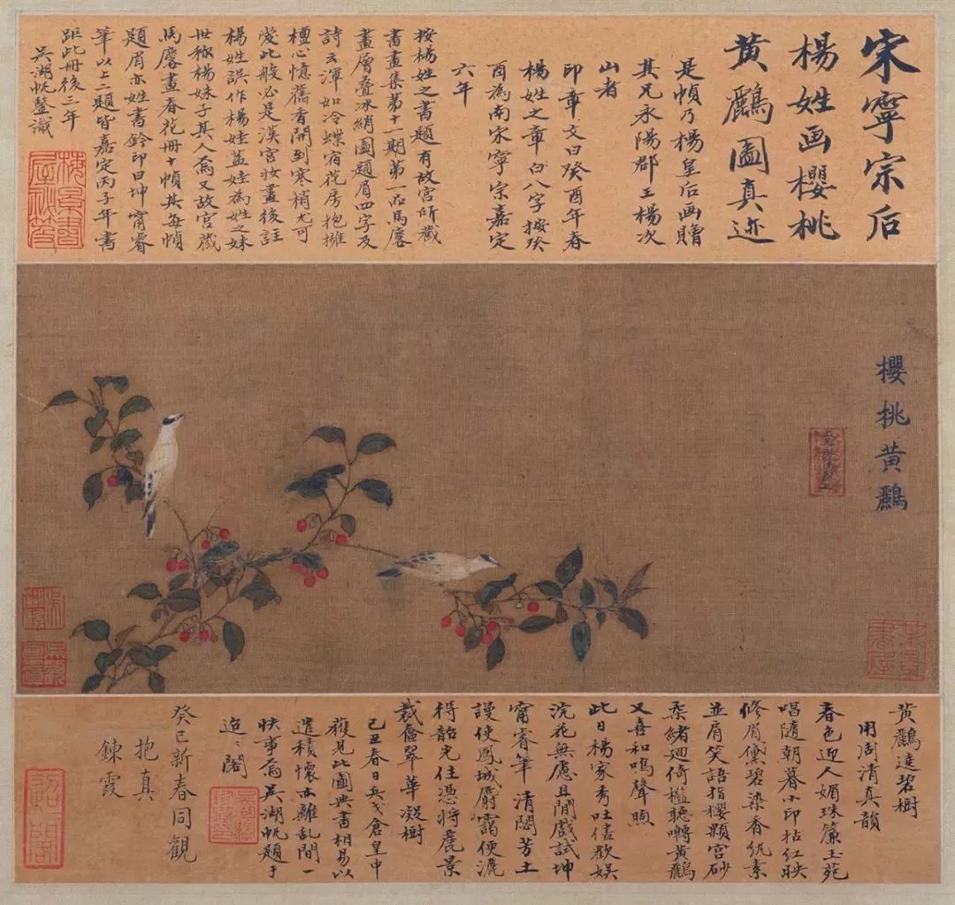 本页作者不详,题者系南宋宁宗杨皇后。杨皇后(1162-1233),会稽(今浙江绍兴)人。颇懂诗词,亦有书法墨迹传世。该页曾于上海解放前夕由吴湖帆所得,画面意境在吴氏《黄鹂绕碧树》词题咏一一呈现:“春色迎人媚,珠帘玉苑,唱随朝暮。小印拈红,映修眉黛碧,染香纨素。并肩笑语,指樱颗、宫砂柔绪。回倚槛、听啭黄鹂又喜,和鸣声煦。此日杨家秀吐。尽欢娱、浣花无虑。且閒赋、试坤宁睿笔,清閟芳土。谩使凤城麝霭,便洒得韶光住。凭将丽景裁奁,翠华凝树。”