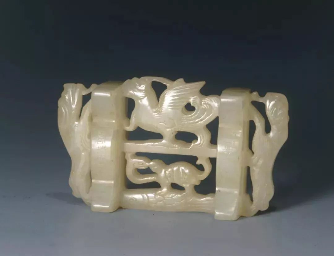 这件上海博物馆藏的东汉玉器名为四灵玉胜。在这件玉器中,象征着五行和方位的青龙、白虎、朱雀、玄武“四灵”分布在左右上下,而象征了西王母头饰的、类似糖果形状的“胜”则分布在两端。