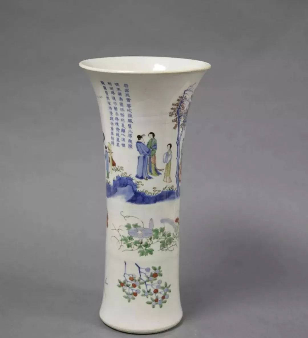 这是一件上海博物馆藏的青花五彩瓷觚,制作年代大致在明末清初。觚是一种腰部收束而口沿、底部呈喇叭状延展的器物,其造型来源于商周青铜酒器,南宋复古潮流兴起后主要用作花器。此觚下部装饰了各种花卉,而上部则描绘了《西厢记》故事。《西厢记》是王实甫创作于元代的杂剧,叙写了书生张生(张君瑞)与相国小姐崔莺莺,在仕女红娘的帮助下,冲破孙飞虎、崔母、郑恒等人的重重阻挠,终成眷属的故事。
